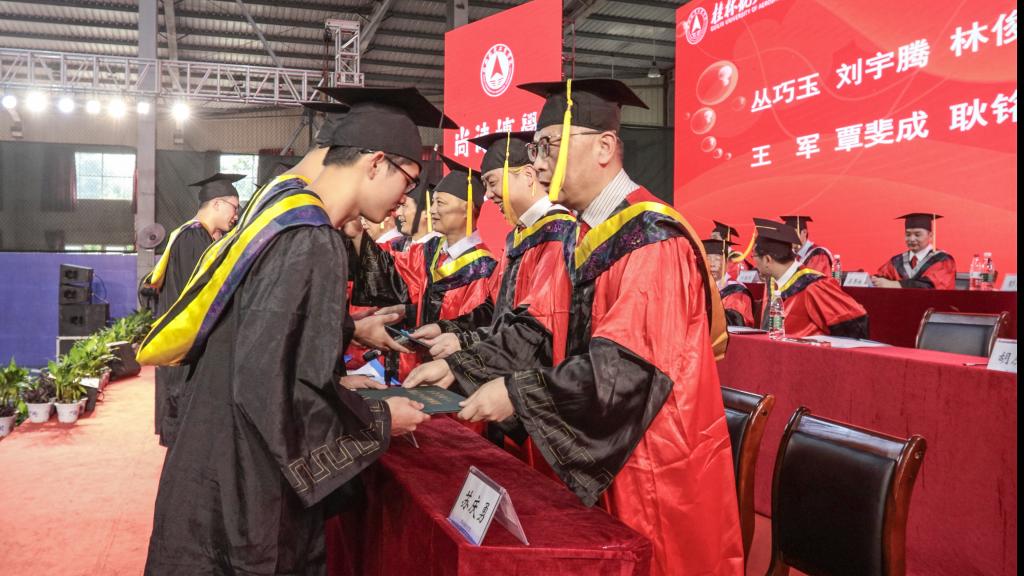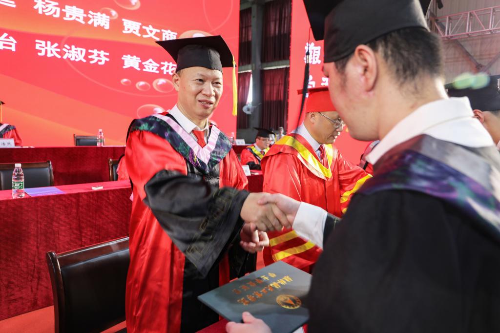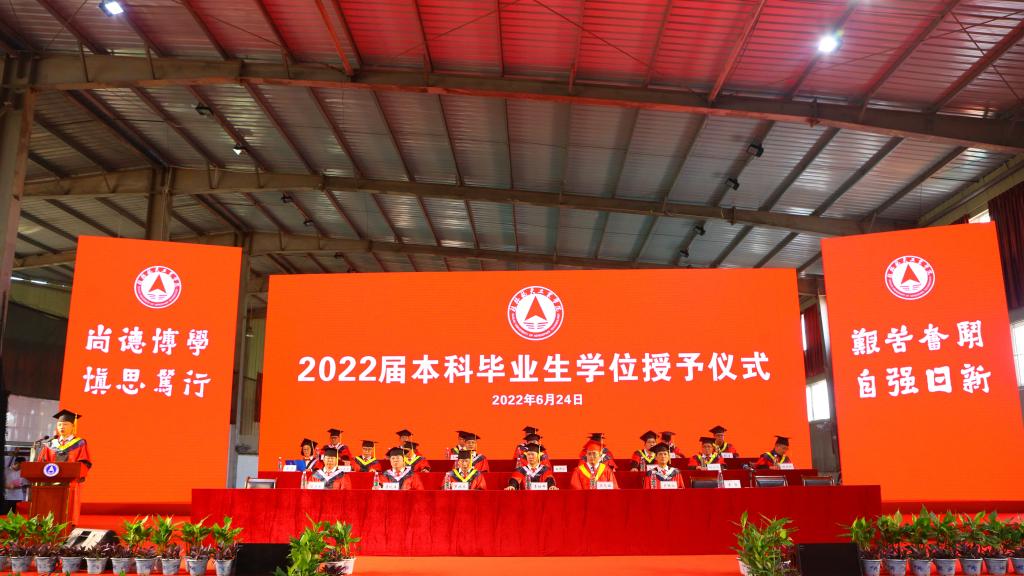 6月24日上午,pp电子2022届本科毕业生学位授予仪式在南校区隆重举行。党委书记李幼平,校长、学位委员会主任吴尽昭,党委副书记罗延忠,副校长罗国湘、詹皖生、李智,校友代表97级工业外贸专业、广西数字方舟信息技术有限公司董事长、南宁校友会常务副会长温京龙先生,以及pp电子学位委员会委员共同为2022届毕业的本科生颁发学士学位证书,正冠扶苏。