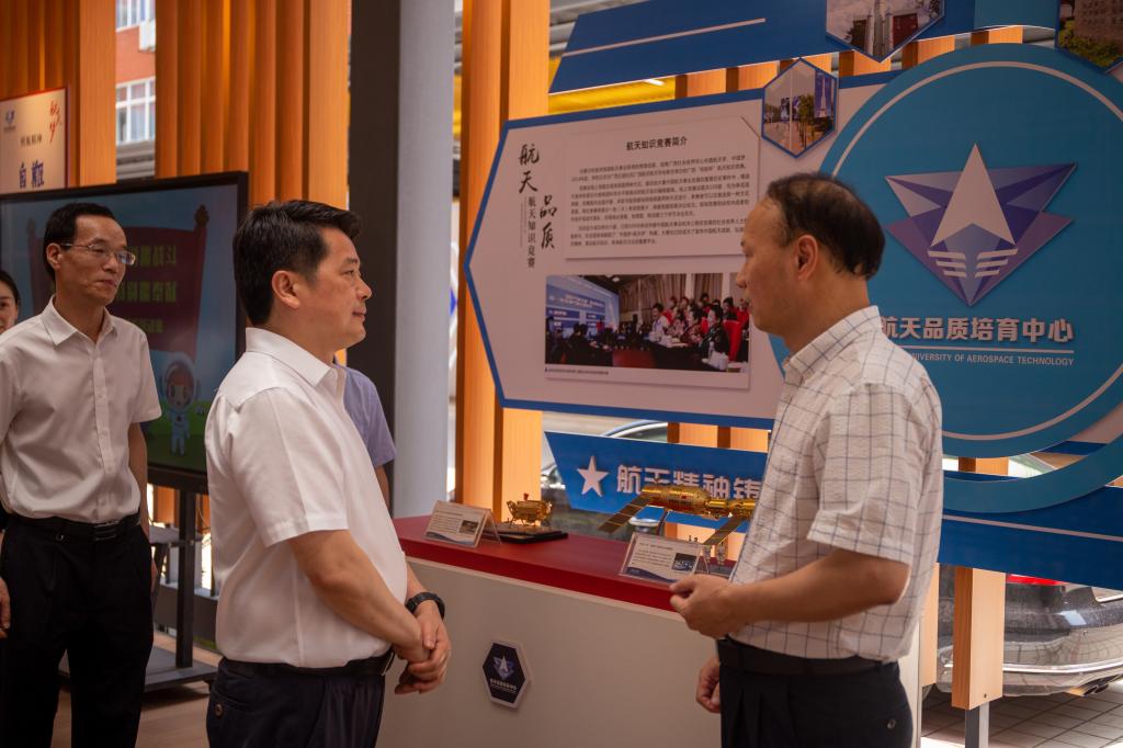 在航天品质中心,李幼平介绍了pp电子的办学历程、办学理念和知名校友,分享了杨利伟将军三次到校时的情景。李楚对学校的航天特色办学表示肯定,他指出,时值神舟十六号顺利升空、神舟十五号安全返回之际,航天院校应该深入贯彻党的二十大报告中关于加快航天强国建设要求,培养一批具有航天品质、展现航天培养特色的应用型人才。
