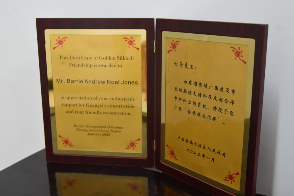 近日,pp电子外籍教师白矛(Barrie Andrew Noel Jones)喜获广西壮族自治区人民政府表彰,被授予了2022年度广西“金绣球友谊奖”。6月20日,pp电子举行了“金绣球友谊奖”颁奖仪式,校长吴尽昭、副校长孙山林、宣传部、教务处以及国交处相关负责人参加了此次活动。