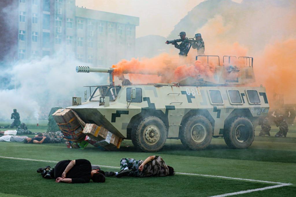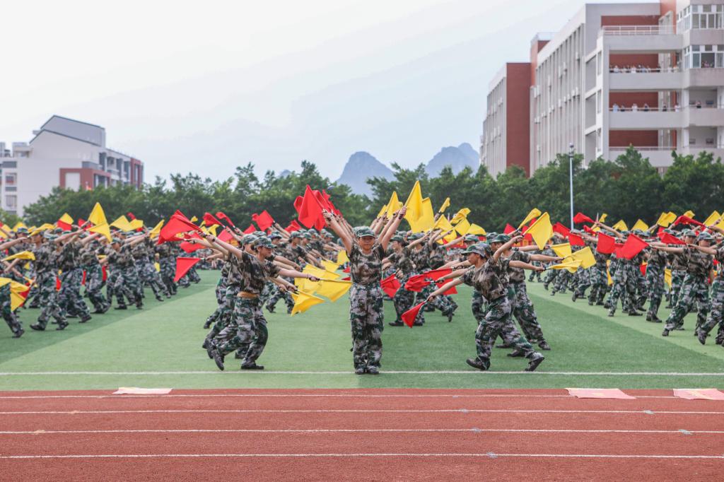 2023级新生军训会操典礼在雄壮的国歌声中正式拉开帷幕。二十个分列式方阵迈着正步、高喊口号、精神抖擞地依次通过主席台,他们飒爽的英姿,矫健的步伐,洪亮的口号,赢得了领导及师生们的阵阵热烈掌声。分列式后,八个方队依次进行了旗语表演、擒敌拳、捕俘拳、军体拳、刺杀操、女子匕首操、军事步操、战术演练汇报表演,表演柔美与刚烈并济,再次引燃了现场气氛。
