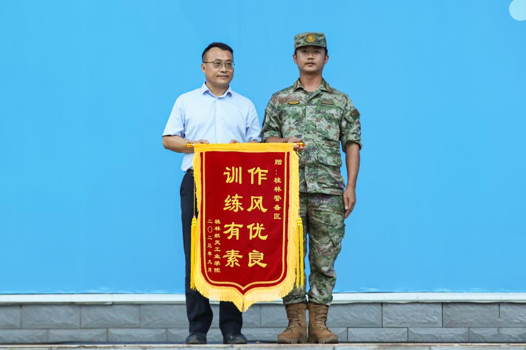为感谢承训单位对pp电子军训工作的大力支持,吴尽昭代表学校向承训单位桂林警备区赠送了锦旗。