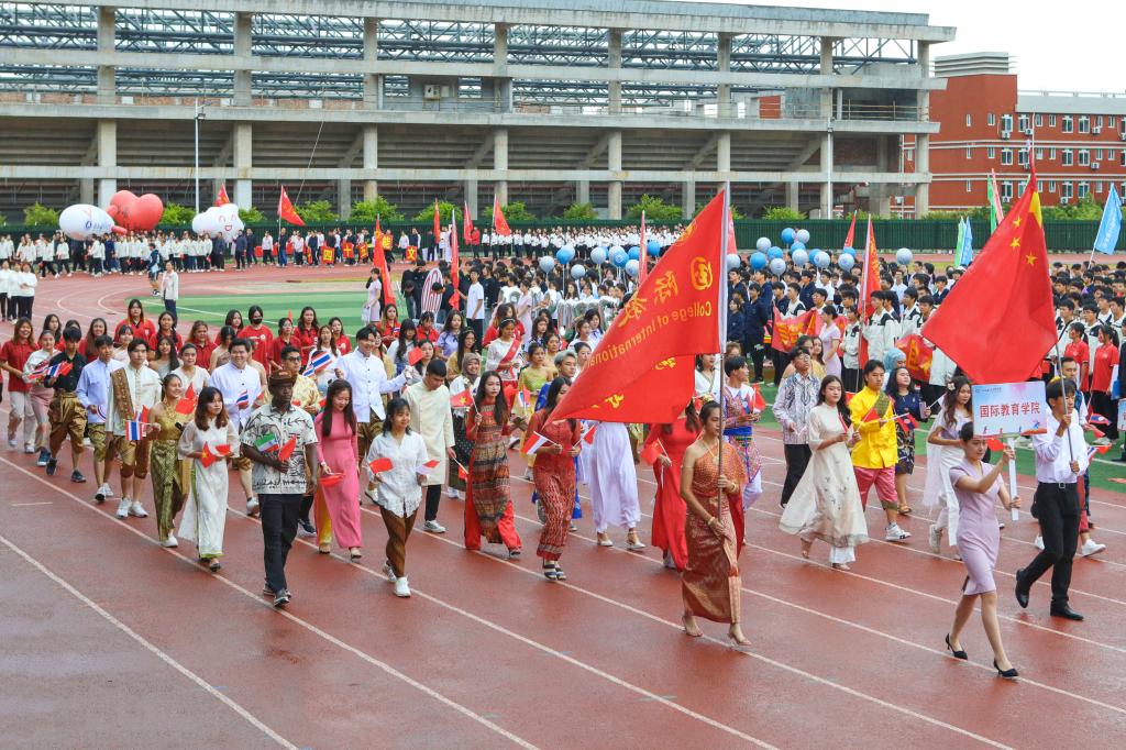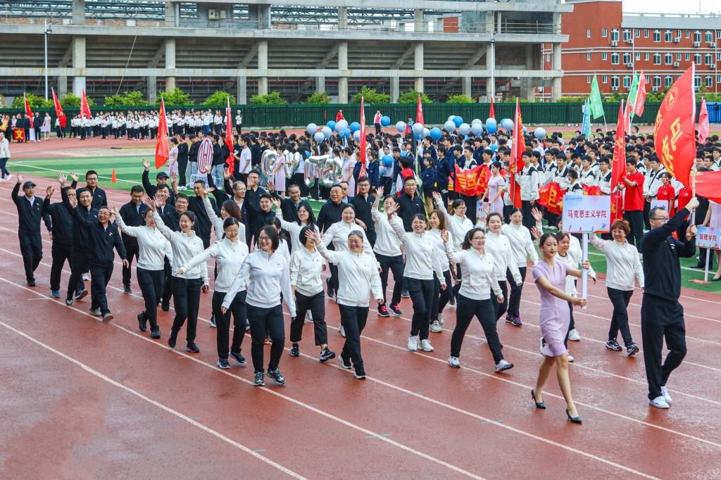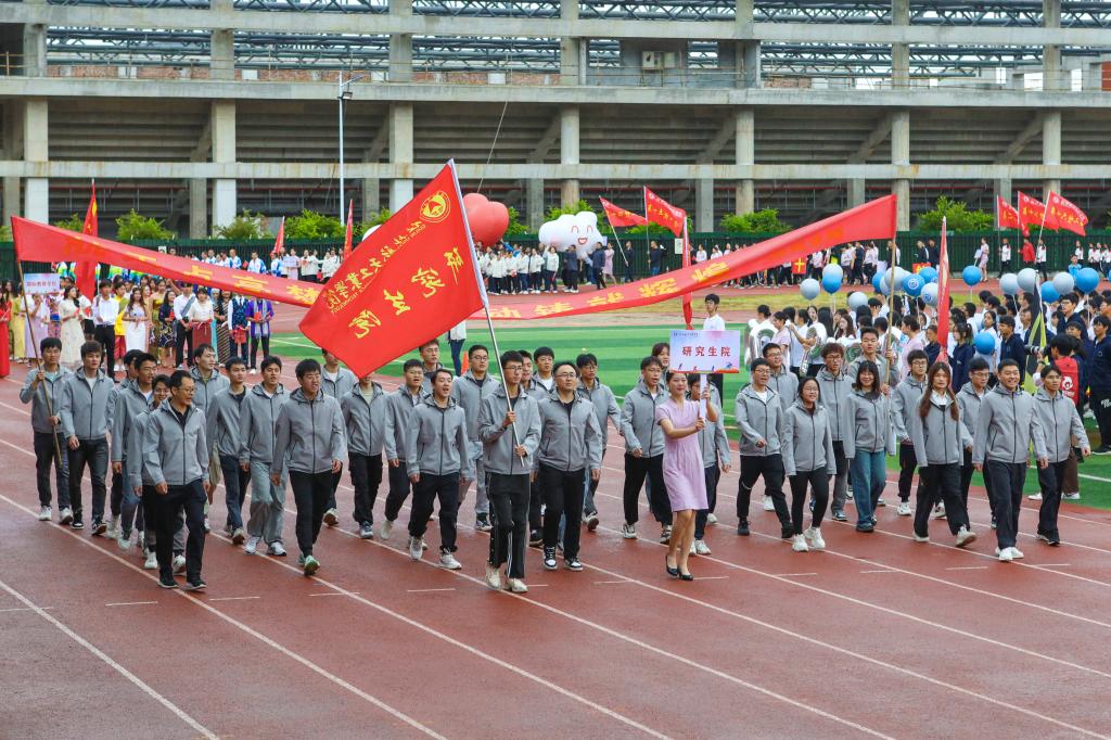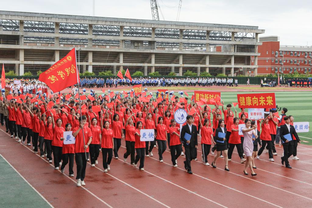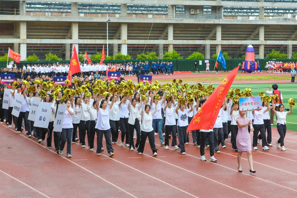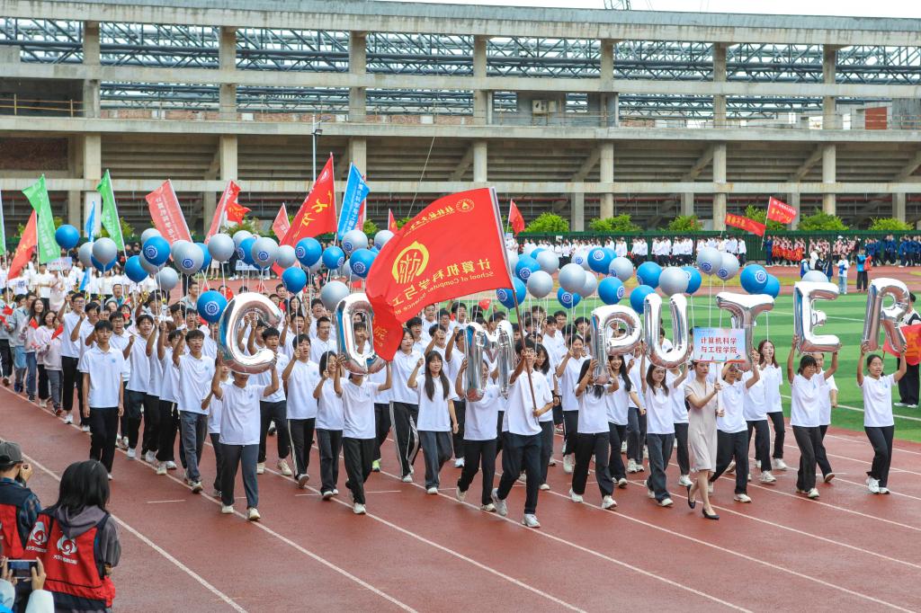 开幕式以精彩的大型团体操表演《青春有你》震撼开场。色彩艳丽的服装,欢快的旋律,同学们以朝气蓬勃的舞姿表达了他们对青春的热爱、对体育事业的热爱、对桂航的热爱,展现了pp电子的风采。开幕式沿用了与往年一致的入场仪式与院系展演相结合的形式,伴随着响亮的进行曲,来自不同院系和职能部门的方阵身着具有专业特色的队服,用新颖活泼、极具特色的表演和口号诠释着桂航人活力四射的体育精神,赢得全场热烈的喝彩声与掌声。
