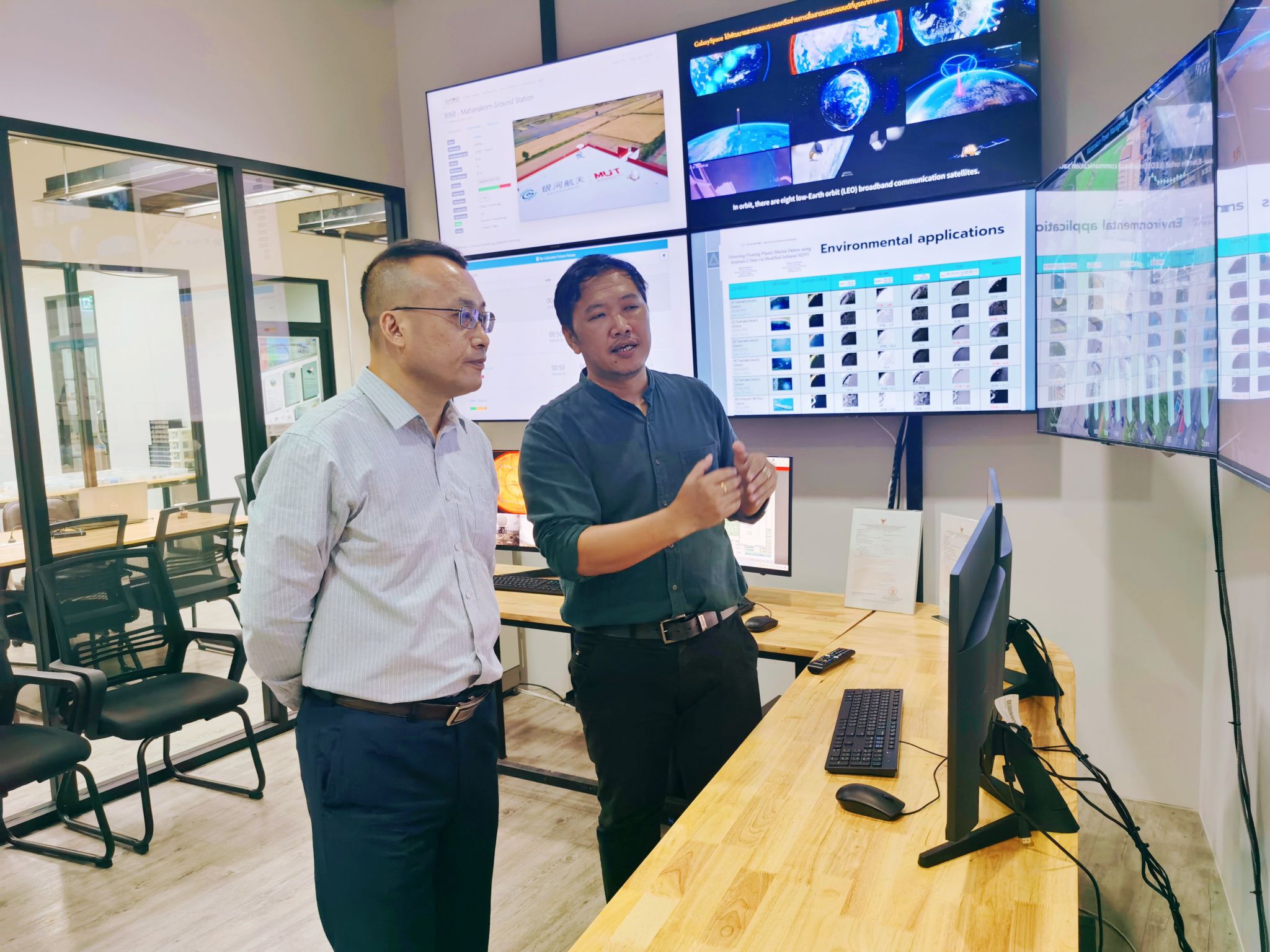 在访问泰国期间,泰国马汉科理工大学校长Panavy Pookaiyaudom、副校长吴宇浩及相关部门负责人热情接待了pp电子访问团。吴尽昭对马汉科理工大学的热情接待表示感谢,双方重点围绕中国-东盟航天工程师学院的建设展开讨论,在空间信息、智能制造、卫星通信等专业建立联合实验室以及共同申报东盟重大专项课题等方面深入交换了意见,双方一致表示将以此次访问为契机,推进两校合作见实效。会谈后,访问团参观了该校的机器人应用、智能制造实验室以及卫星地面基站等教学科研设施。