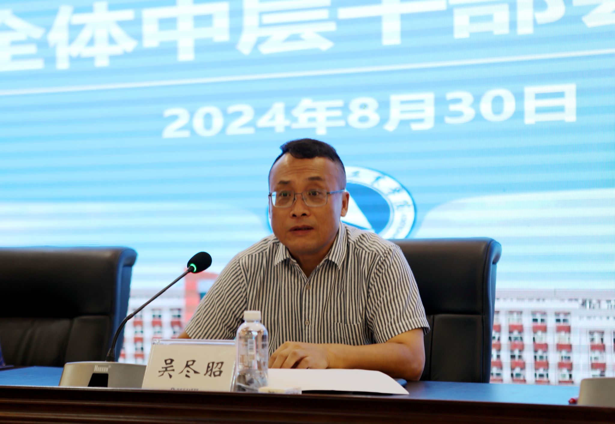 8月30日上午,学校在飞天楼520会议室召开新学期全体中层干部大会,谋划部署2024年秋季学期各项工作任务,动员全体干部进一步统一思想,真抓实干,共同推动学校事业发展取得更大成效。校党委书记韩峻峰总结上半年工作、部署秋季学期工作,校党委副书记、校长吴尽昭主持会议并讲话,全体校领导、中层领导干部参加会议。