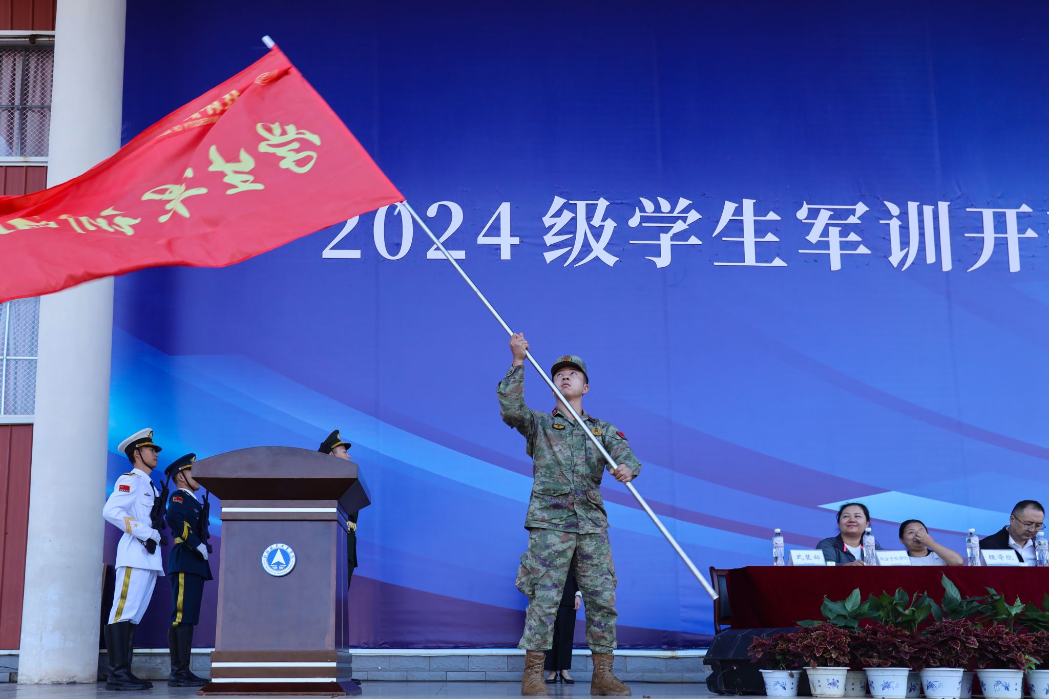 在开营仪式上,吴江萍副书记向2024级学生军训团授军训团团旗并作动员讲话。她指出,军训作为国防教育第一课,是新时代青年必须经历的精神洗礼,是培养同学们航天品质的重要课程。学校坚持“塑形”与“塑魂”相结合,注重融入爱党、爱国、爱军教育内容,训家国情怀、训战斗精神、训责任担当,充分发挥学生军训国防教育功能。吴江萍副书记对全体参训同学提出三点要求:一要端正训练态度,积极参加训练;二要遵守训练纪律,听从教官指挥;三要秉承航天精神,展现桂航风采,圆满完成此次军事训练任务。