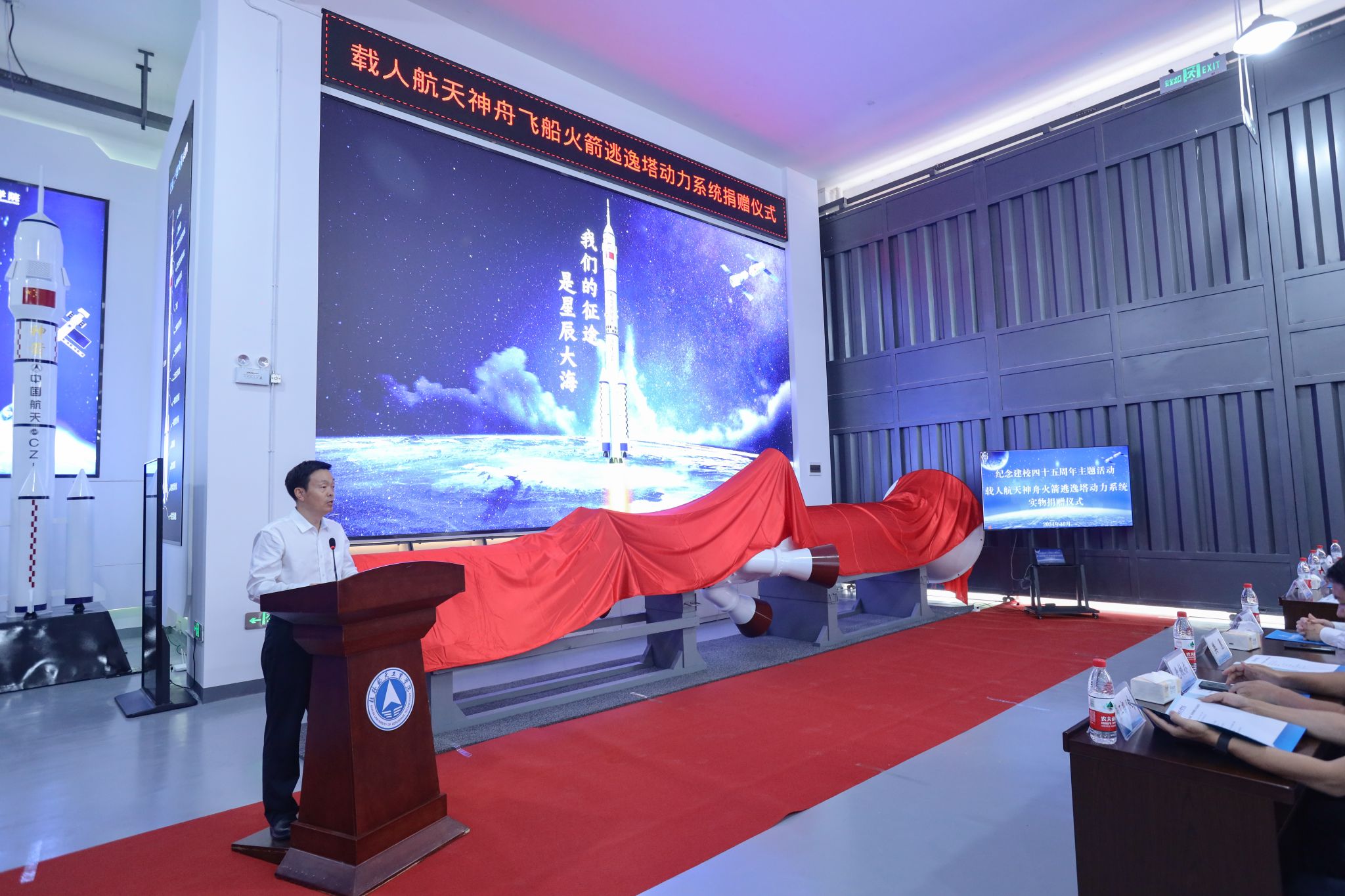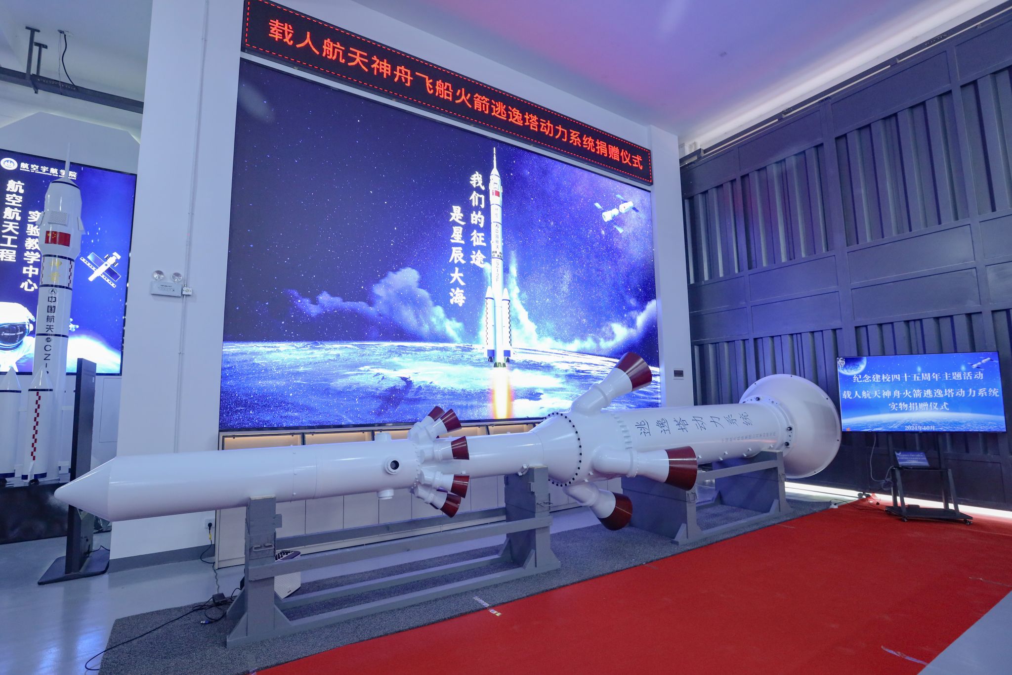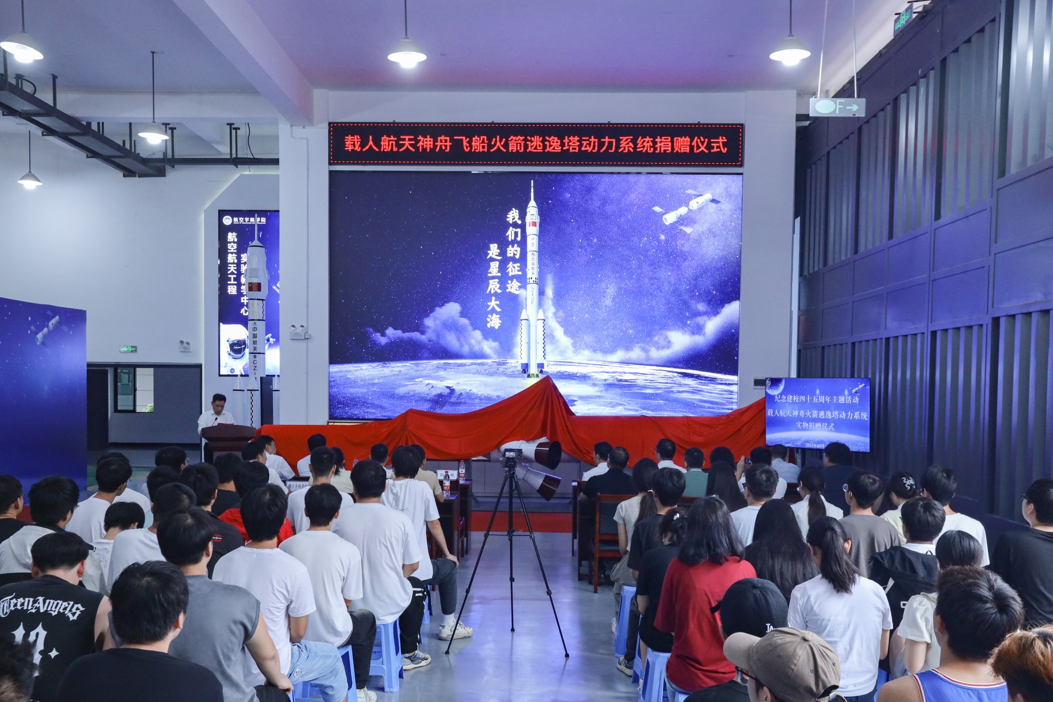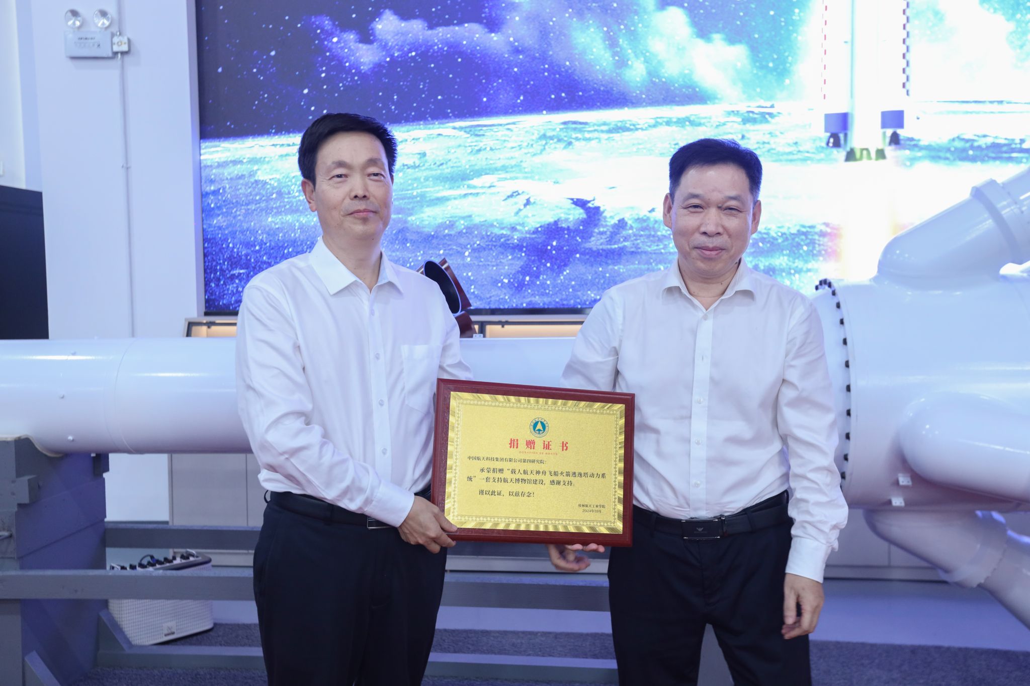据悉,这套保证航天员生命安全的火箭逃逸救生系统正是由航天科技四院研制的。航天科技四院始建于1962年,是我国历史最久、规模最大、专业最全、配套最完整的固体火箭发动机专业研究院。此次捐赠不仅为航天精神的传承与发展增添了新的动力,也进一步激发师生对科技创新技术的热爱和求索精神,进一步丰富了教育资源与实物教学、激发了研究兴趣与创新启发,为学校“钱学森”班的组建奠定了良好基础,为航天品质应用型人才培养注入新动能。