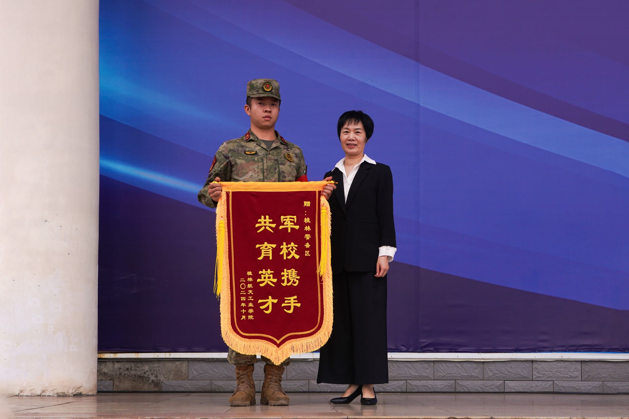 为感谢承训单位对pp电子军训工作的大力支持,吴江萍代表学校向承训单位桂林警备区赠送了“军校携手 共育英才”的锦旗。