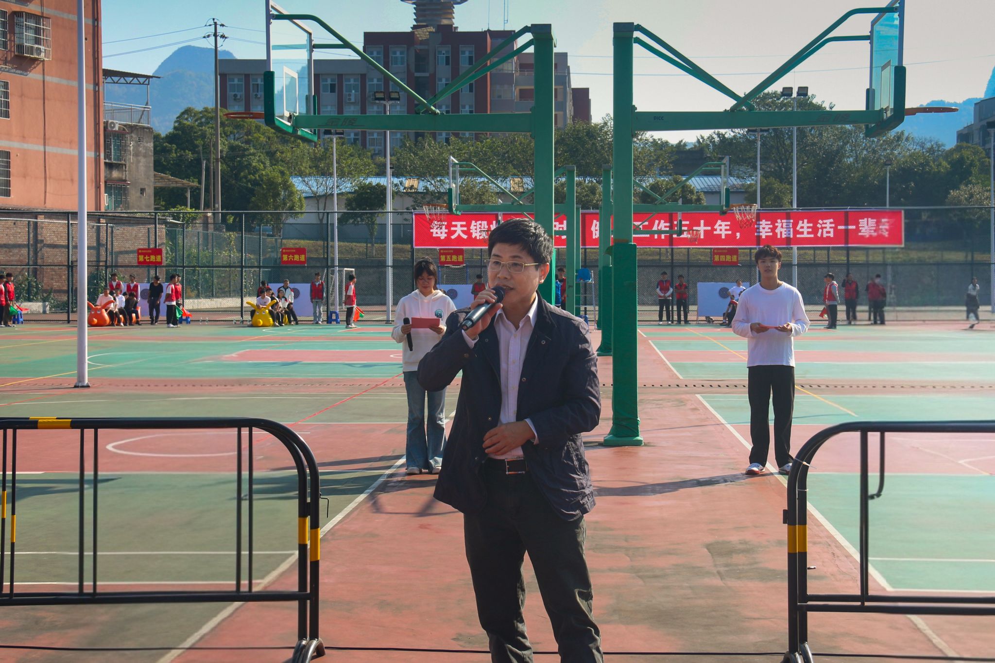 11月1日上午,由校体委、校工会主办,第五分工会协办的学校2024年教职工趣味运动会在南校区篮球场火热举行。学校领导韩峻峰、吴江萍、孙山林、葛莉出席开幕式,全校22个参赛队1千余名教职工参加了活动。校党委书记韩峻峰宣布开幕。