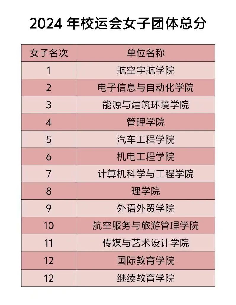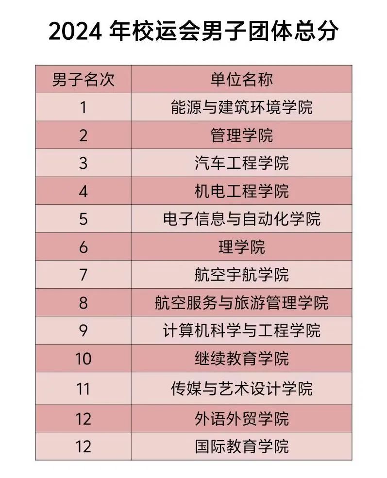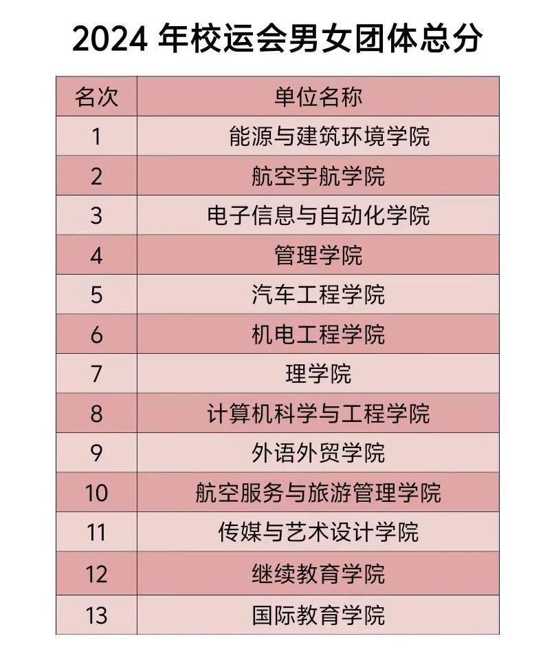 闭幕式上,本届运动会总裁判长杨忠明老师宣读比赛成绩:能源与建筑环境学院以236分夺得团体总分第一名,航空宇航学院、电子信息与自动化学院分别以163分和152分获得团体总分第二名、第三名;能源与建筑环境学院、航空宇航学院、计算机科学与工程学院、电子信息与自动化学院、机电工程学院等五个单位获得优秀组织奖。