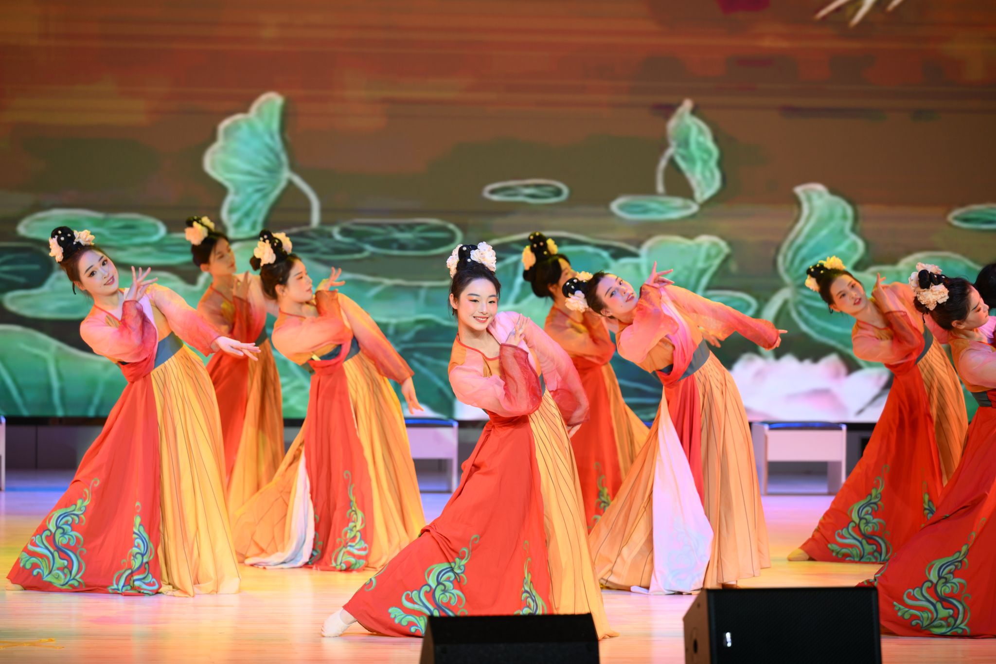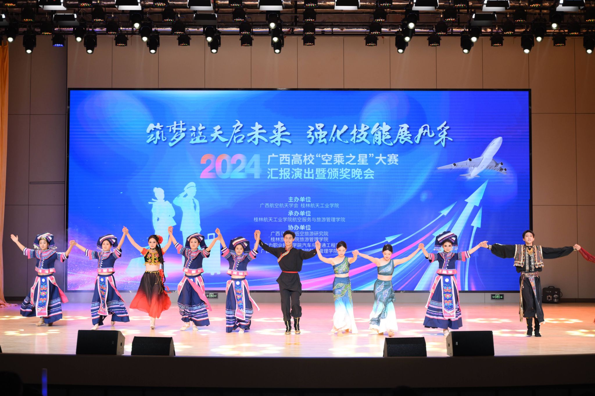 晚会以“筑梦蓝天启未来,强化技能展风采”为主题,共分为“鉴往知来·筑梦蓝天”、“青春相聚·逐梦蓝天”和“未来可期·圆梦蓝天”三个篇章,通过一系列精彩纷呈的表演,展现了广西高校航空服务类专业学子们的专业技能和艺术风采。其中,节目《族舞绮梦》由pp电子与桂林航空有限公司首批订单式培养学生表演,生动展现了校企合作的优良教学成果。