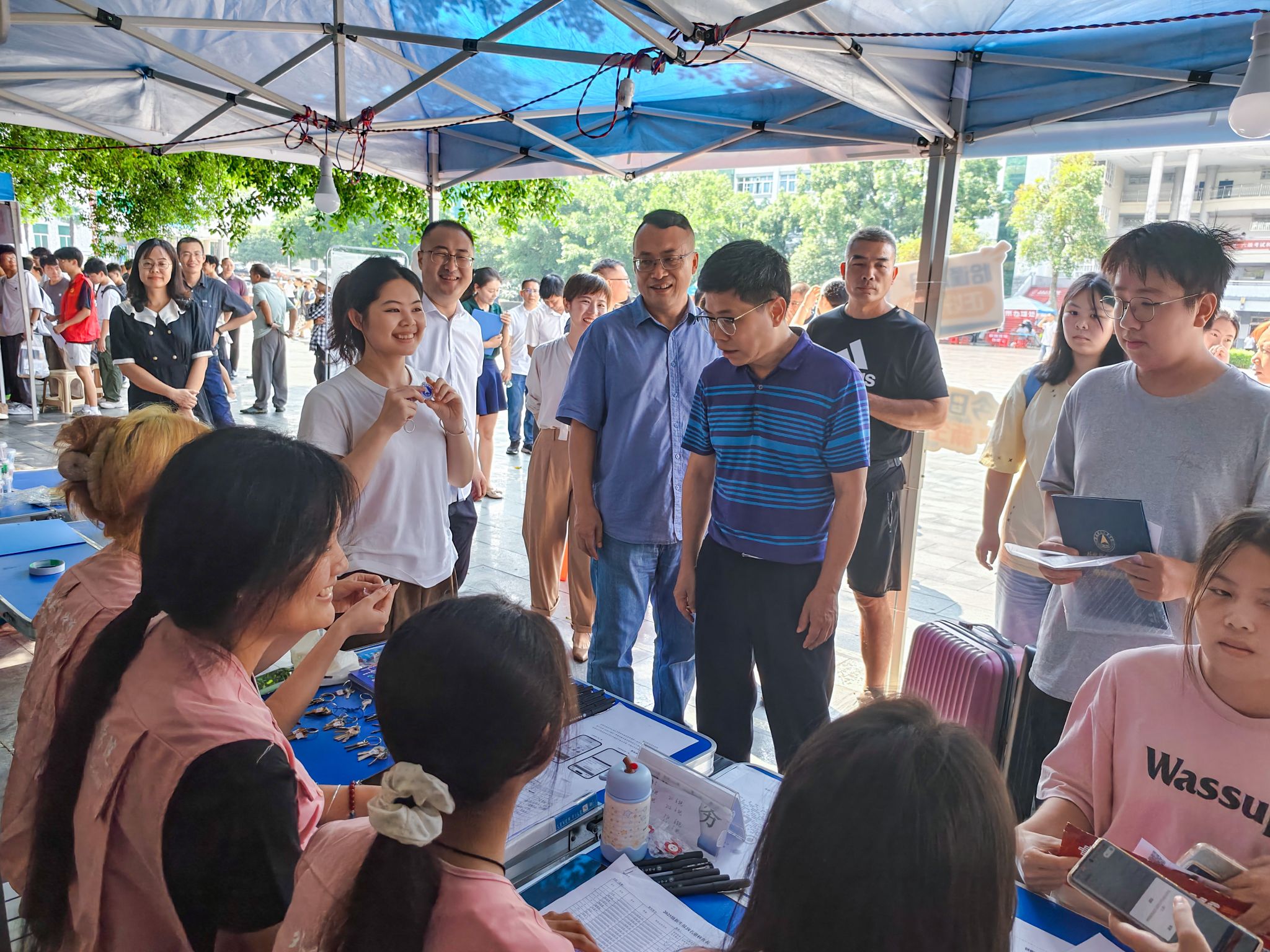 在南北校区迎新大本营,校领导听取了相关部门和学院负责人关于迎新工作的汇报,与远道而来的新生进行亲切交谈,并对新生家长的支持表示衷心感谢,请家长们放心将孩子交给学校,携手开展家校共育。