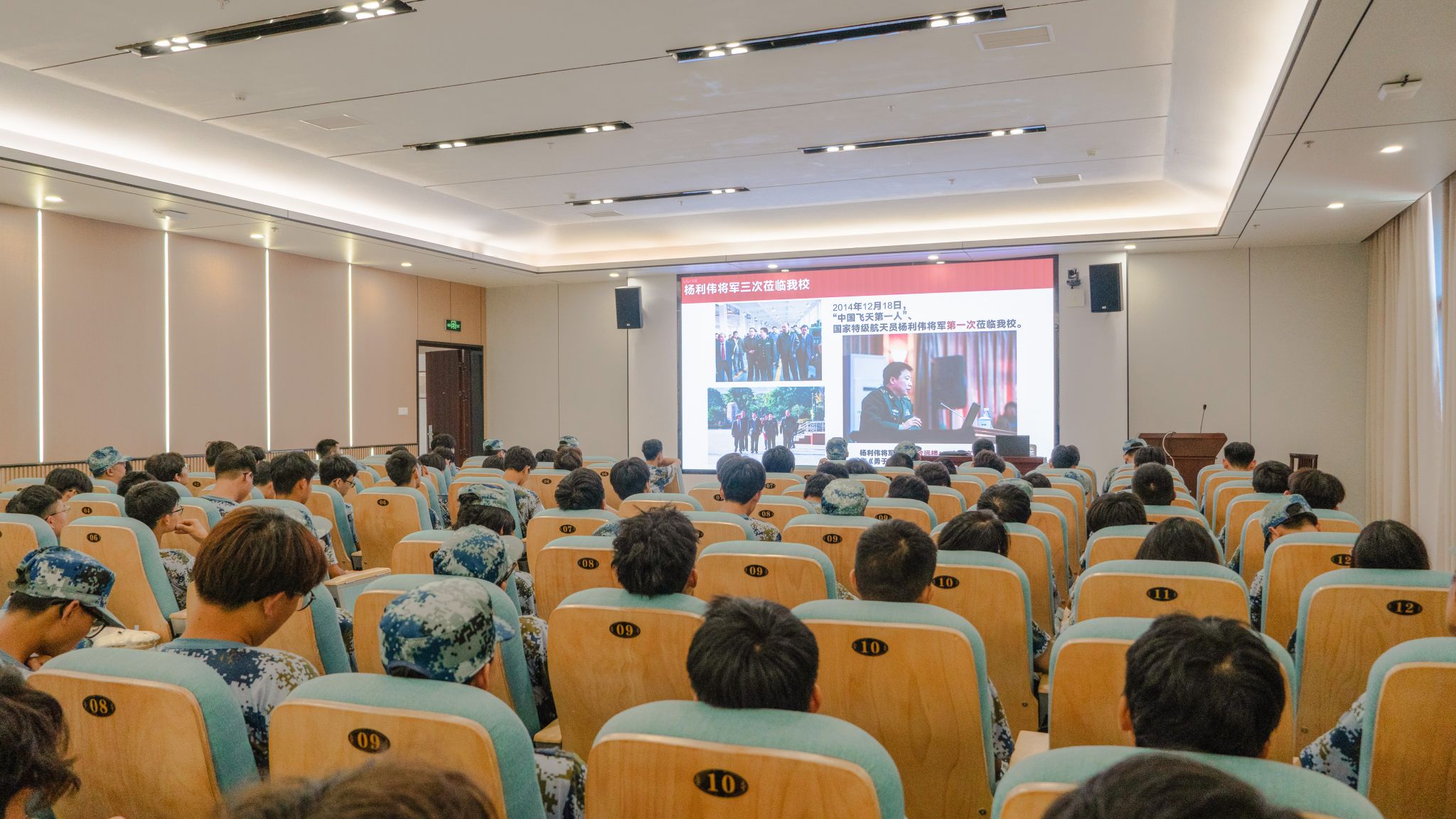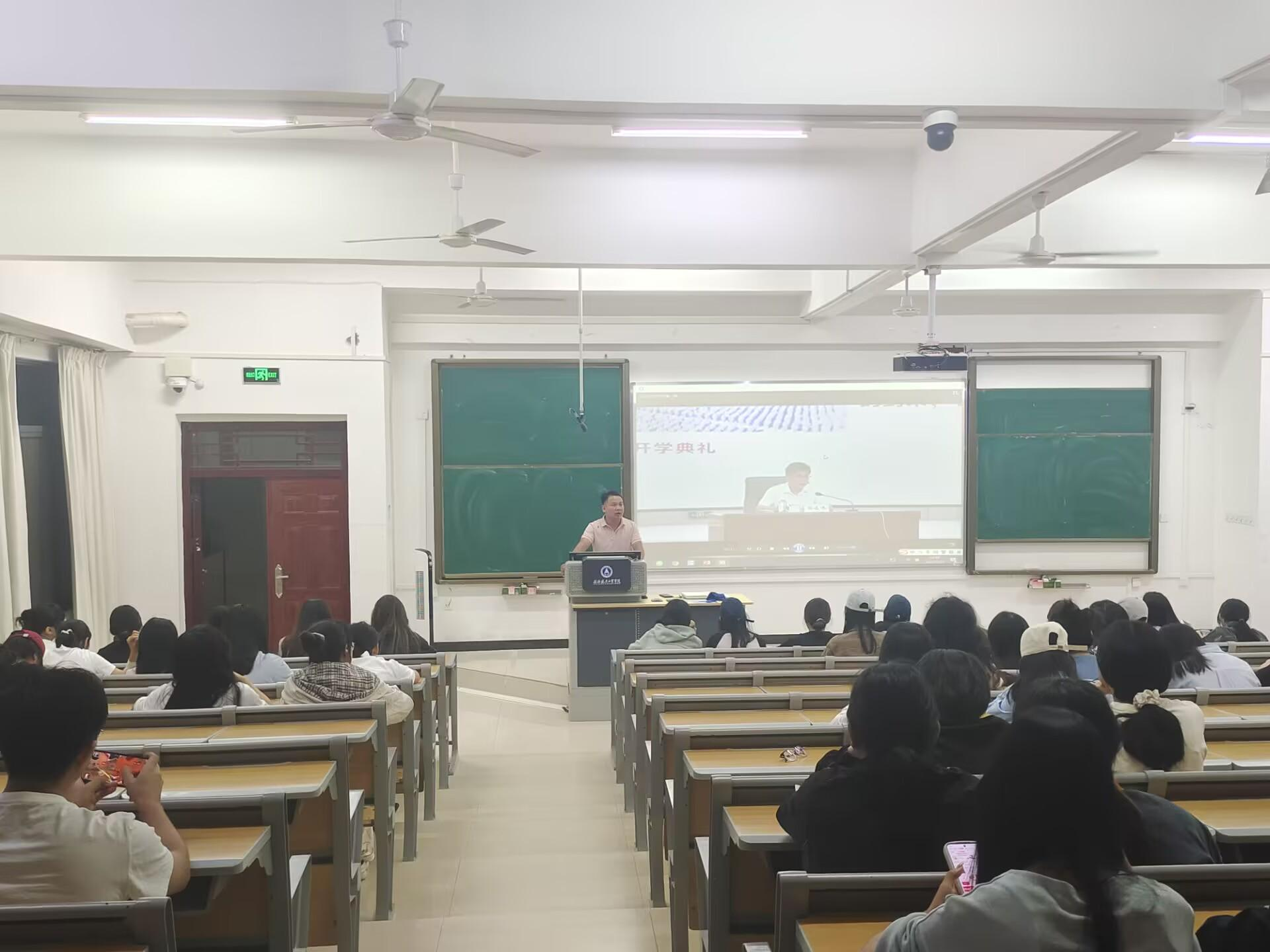 韩峻峰围绕深入学习贯彻习近平总书记关于广西工作论述的重要要求、中国共产党人精神谱系当中的航天精神、学校46年的发展历史、校园特色文化景观、名师学者代表等内容为新生讲授“开学第一课”。