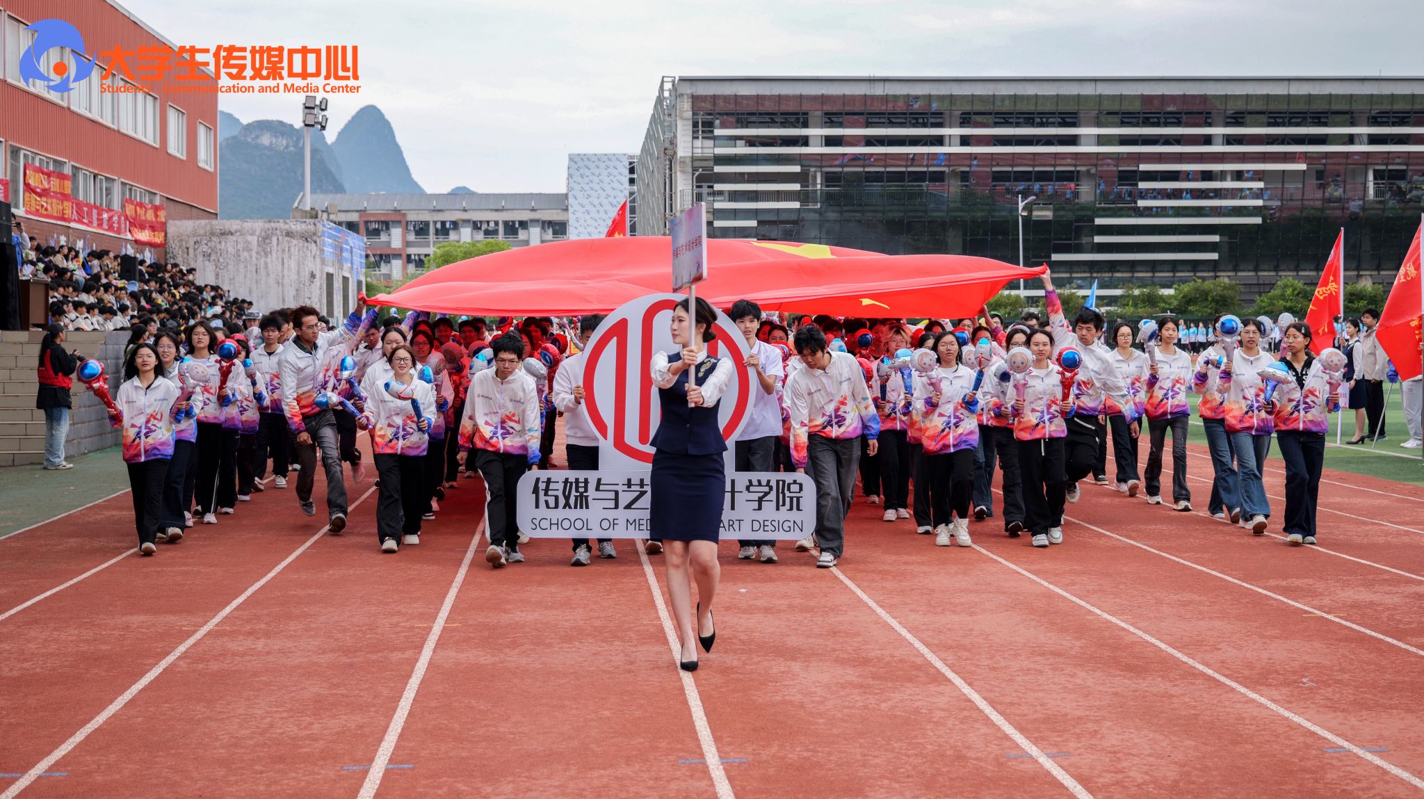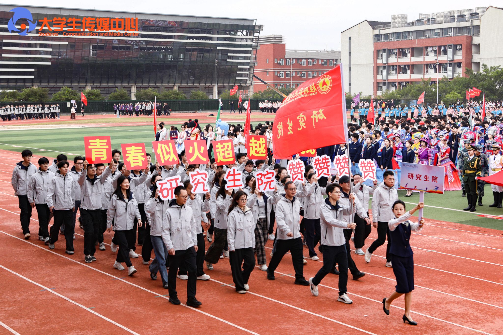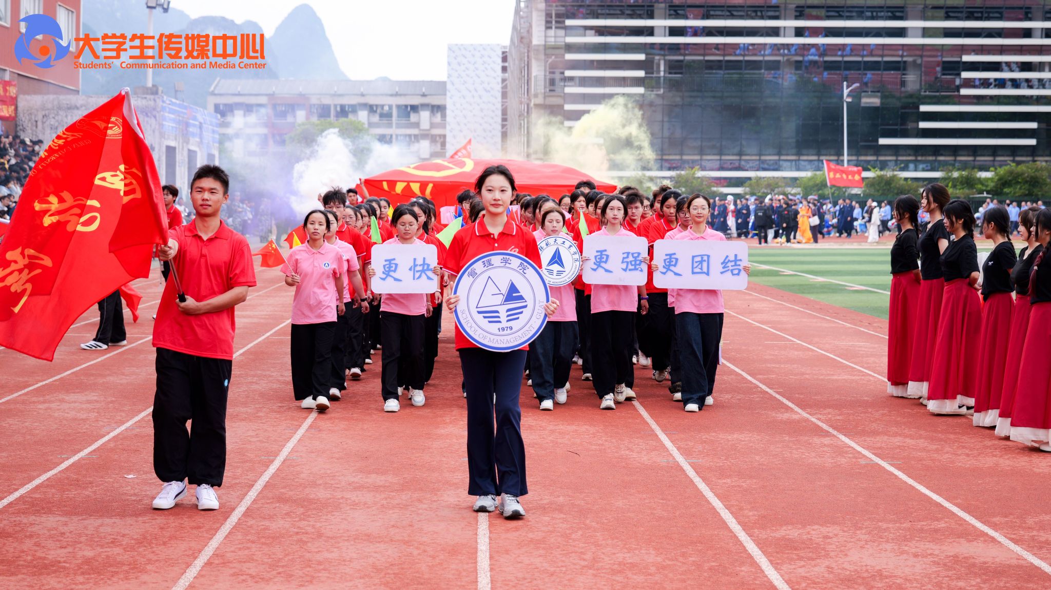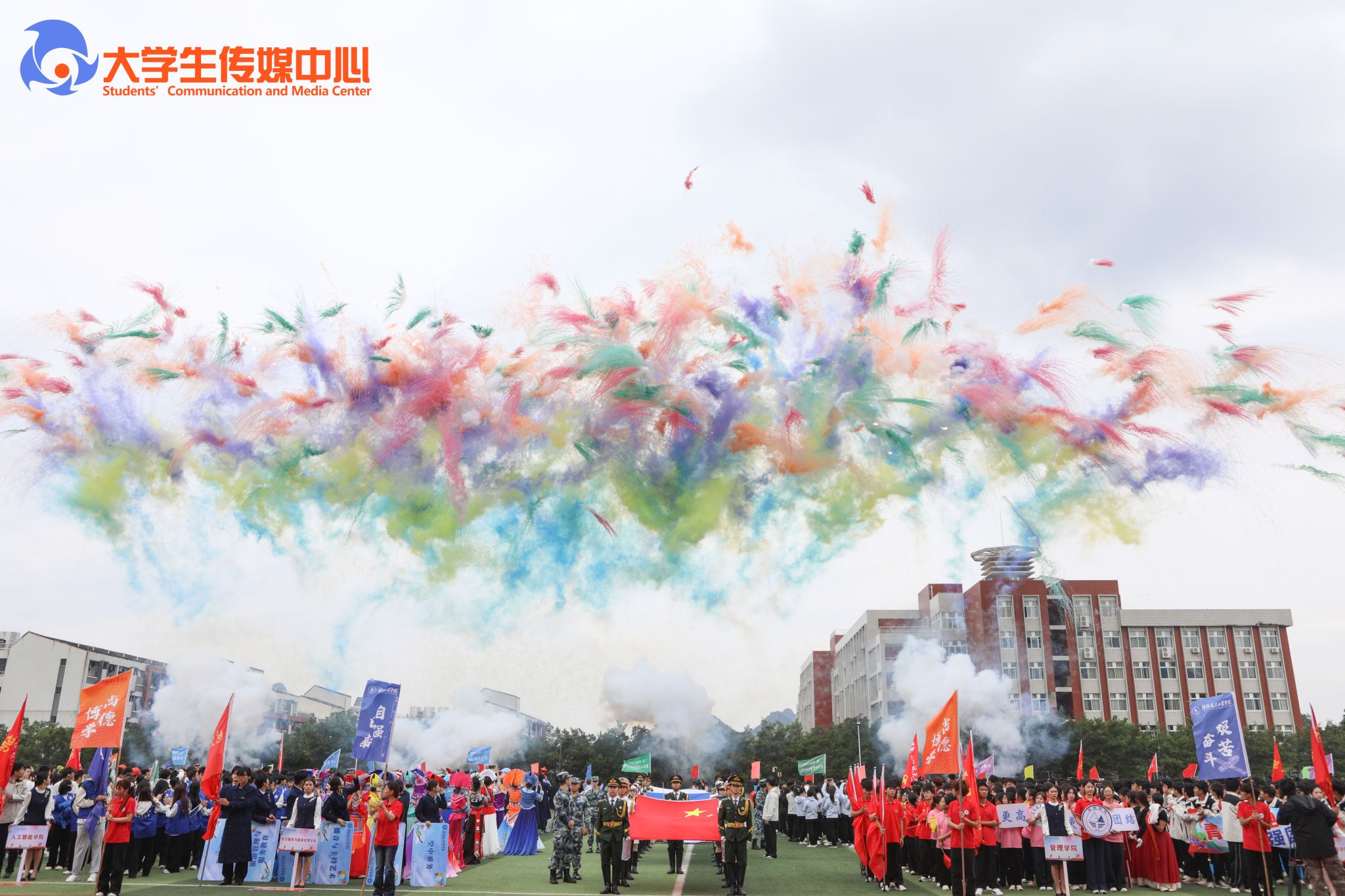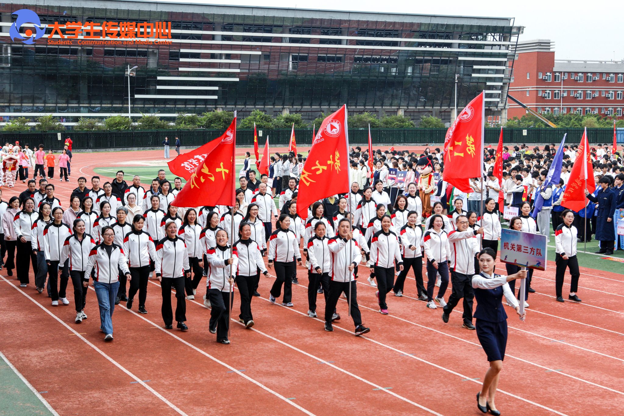 广播体操展示《律动青春》拉开了本次开幕式的序幕。国旗班方队步伐铿锵、身姿挺拔,庄严护卫五星红旗、校旗、会旗和会徽率先入场。计算机科学与工程学院与外语外贸学院组成的彩旗队,承载着科创锐气与国际视野阔步走来。随后各教学单位、机关方阵依次入场,口号嘹亮,创意纷呈、各具特色,充分展现了全校师生团结进取、奋发向上的活力与激情。