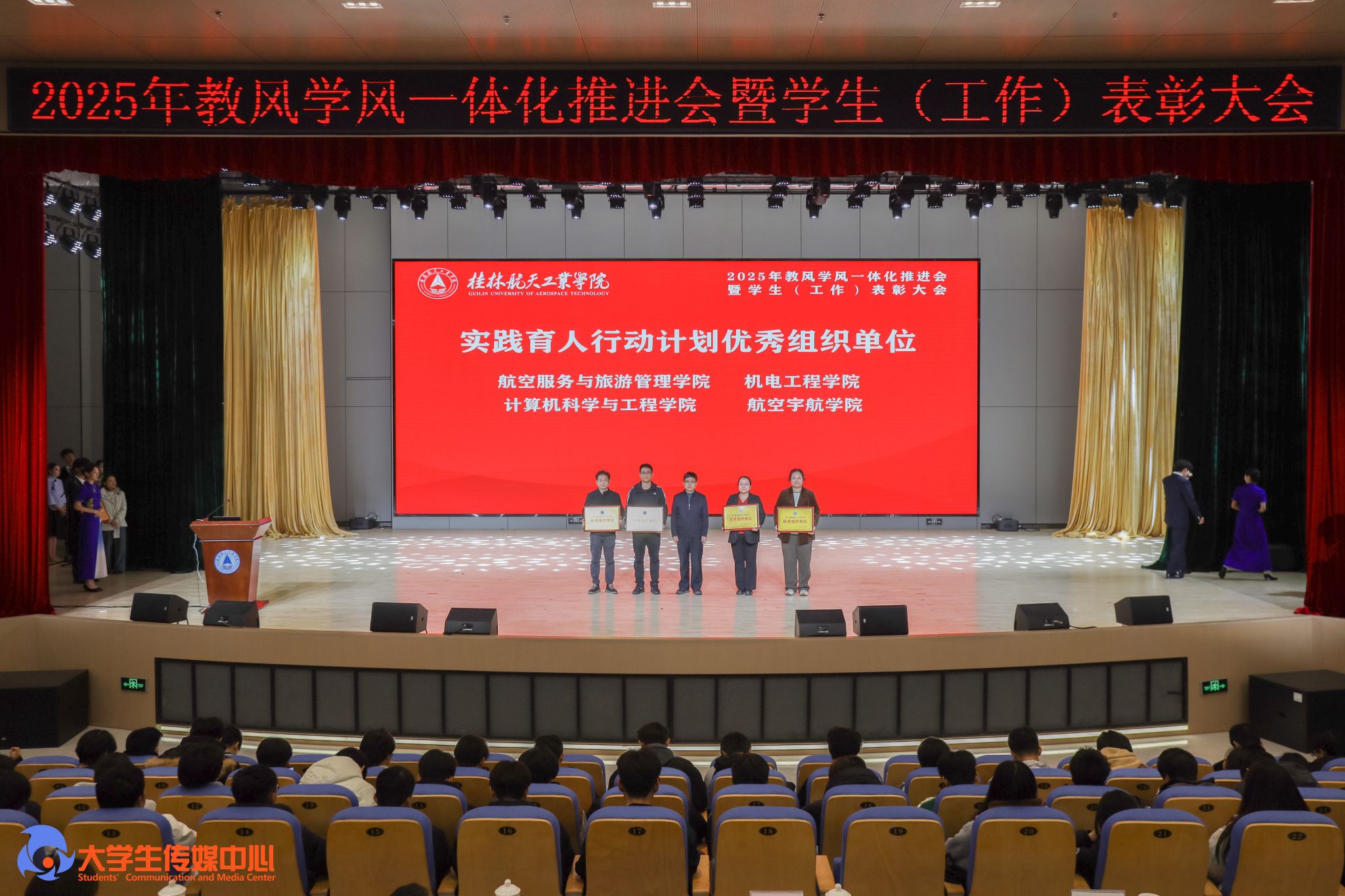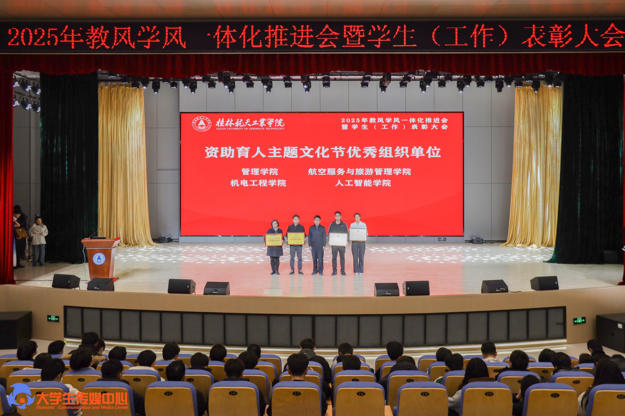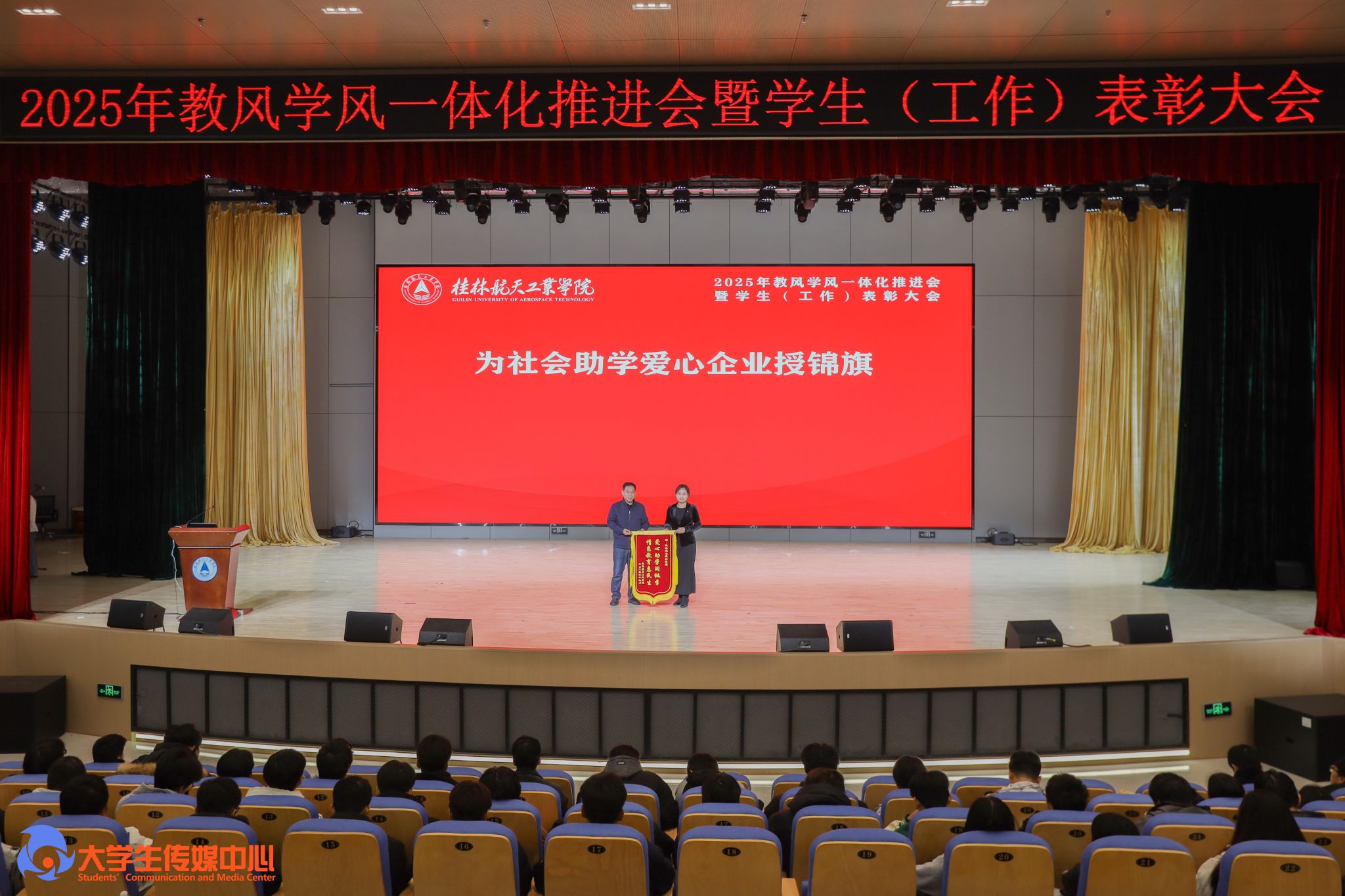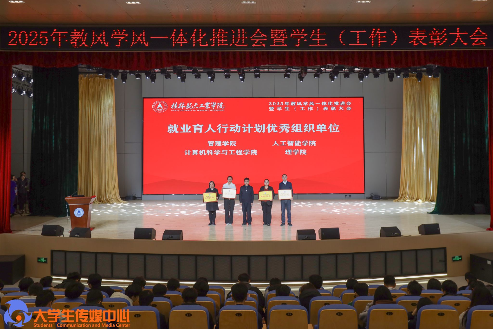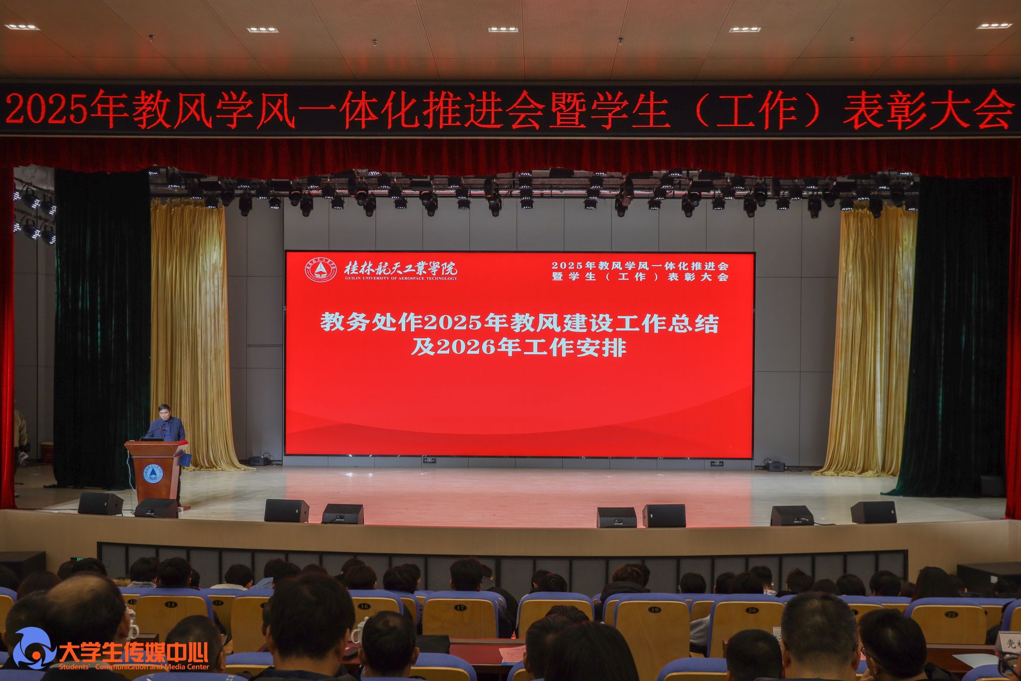 12月23日下午,学校在问天楼图书馆报告厅举行“星辰耀桂航·领航启新章”2025年教风学风一体化推进会暨学生(工作)表彰大会。学校党委书记韩峻峰,党委副书记、校长吴尽昭,党委副书记孙山林出席大会。桂林爱尔眼科医院党支部书记段绪艳、学校党校办、组织部、宣传部、学工部(处)、教务处、校团委等职能部门负责人,各学院党政负责人、专业负责人、教研室主任、辅导员、班主任及获奖学生、在校学生代表共同参加了会议。