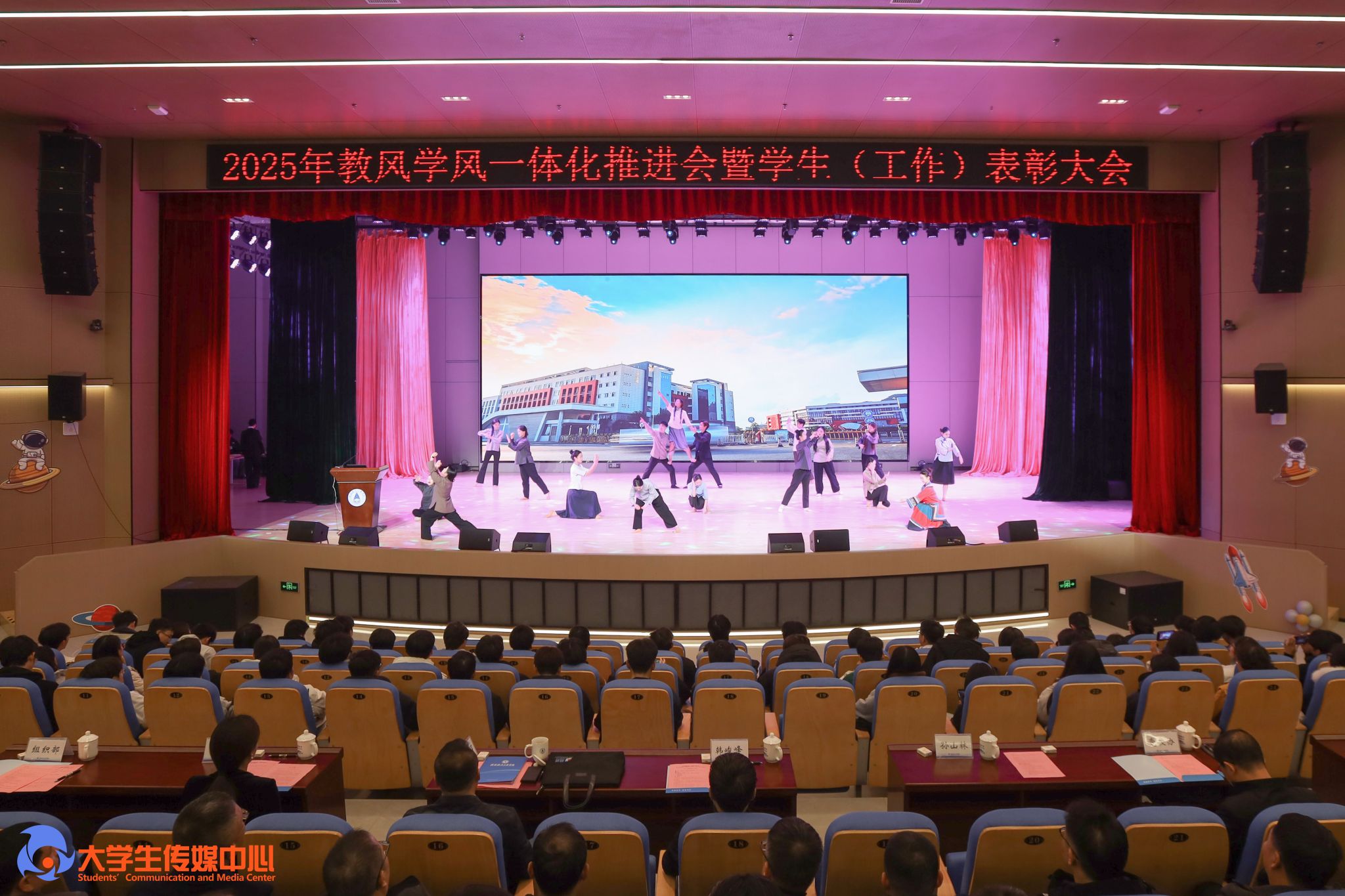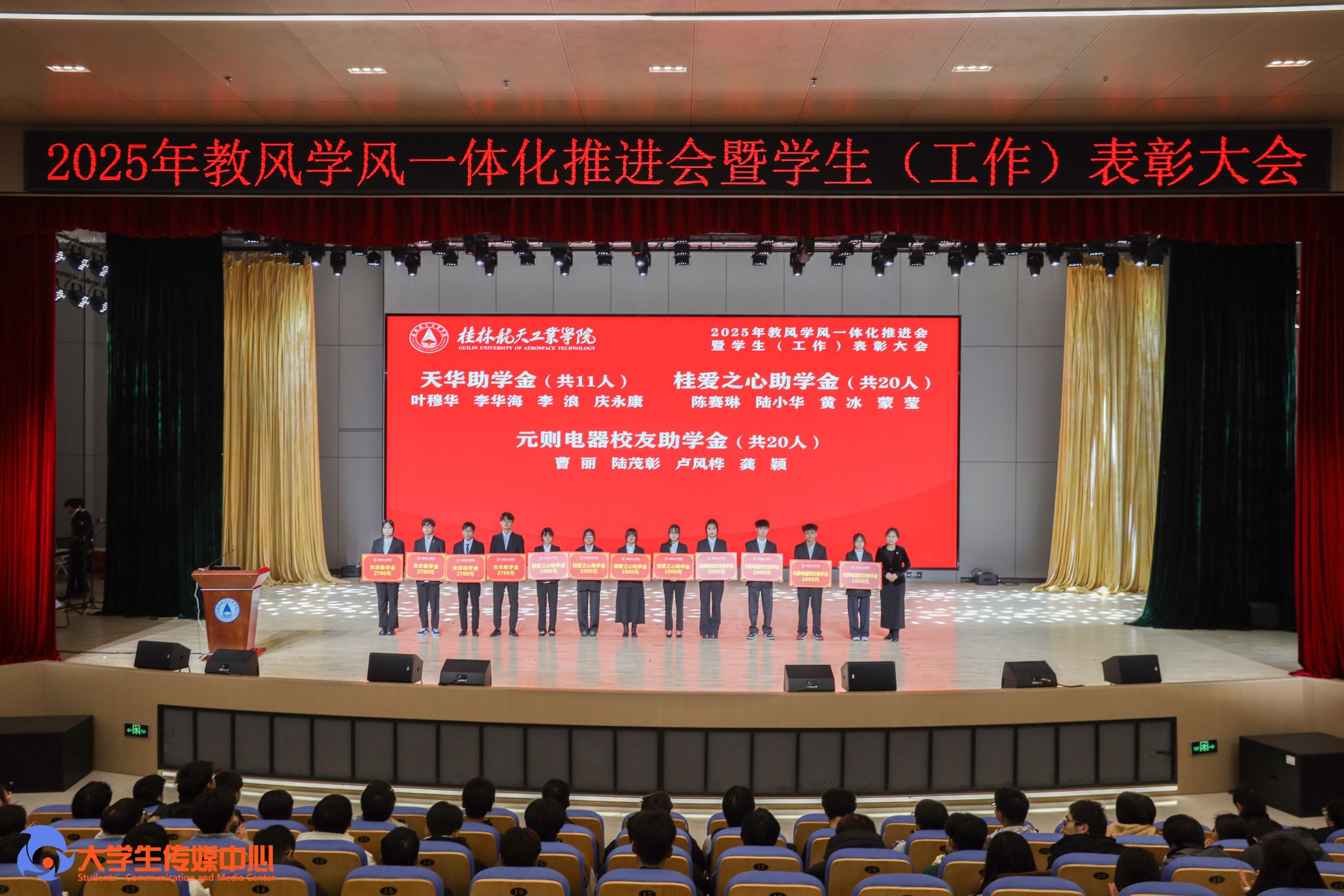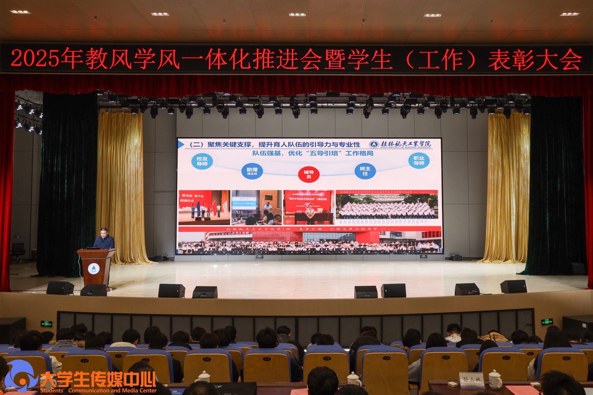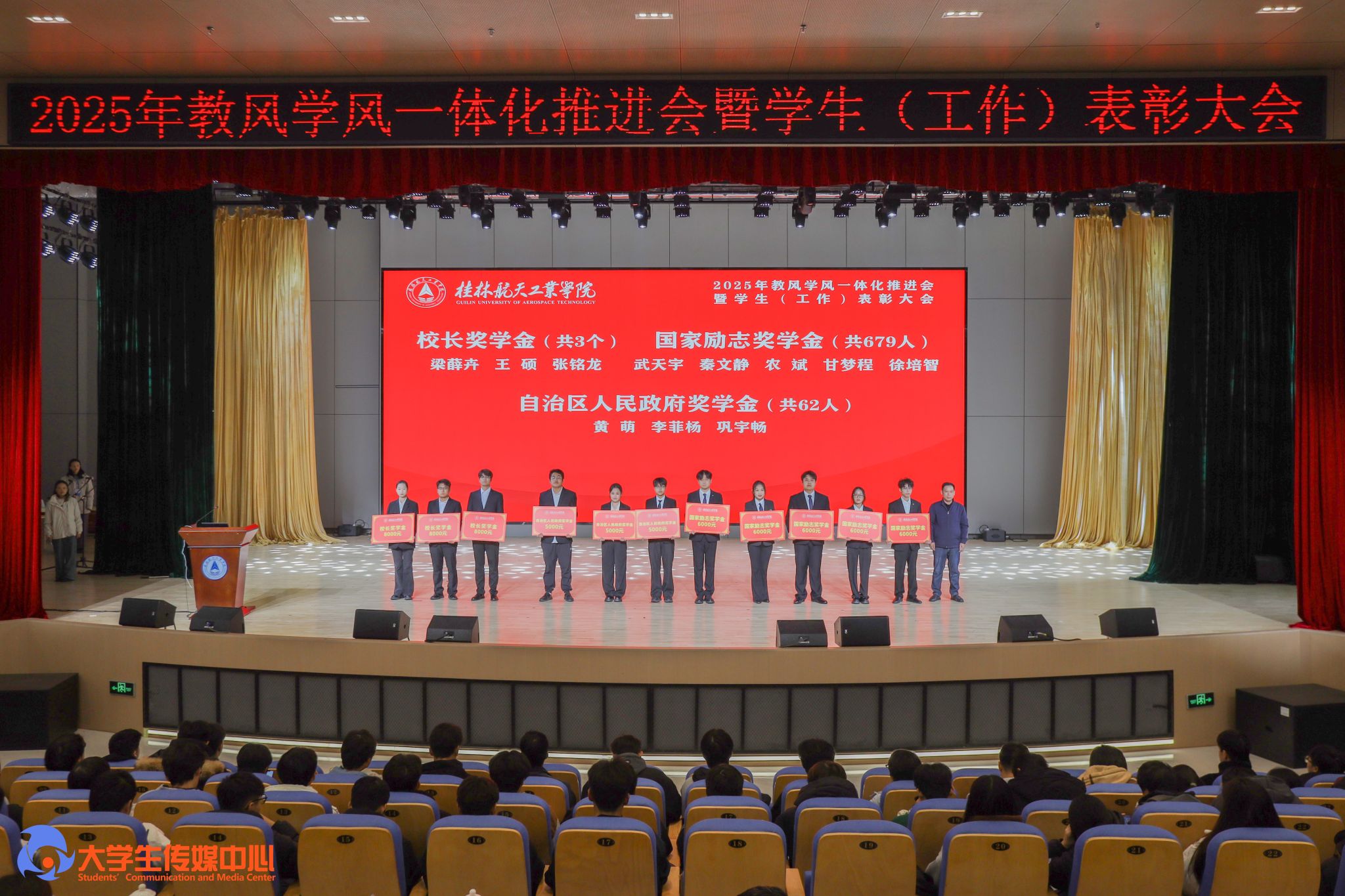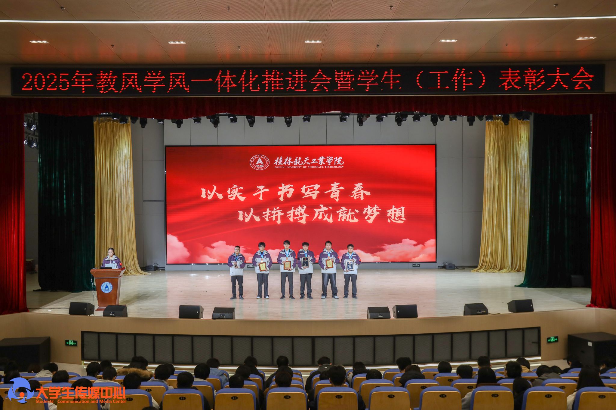 12月23日下午,学校在问天楼图书馆报告厅举行“星辰耀桂航·领航启新章”2025年教风学风一体化推进会暨学生(工作)表彰大会。学校党委书记韩峻峰,党委副书记、校长吴尽昭,党委副书记孙山林出席大会。桂林爱尔眼科医院党支部书记段绪艳、学校党校办、组织部、宣传部、学工部(处)、教务处、校团委等职能部门负责人,各学院党政负责人、专业负责人、教研室主任、辅导员、班主任及获奖学生、在校学生代表共同参加了会议。