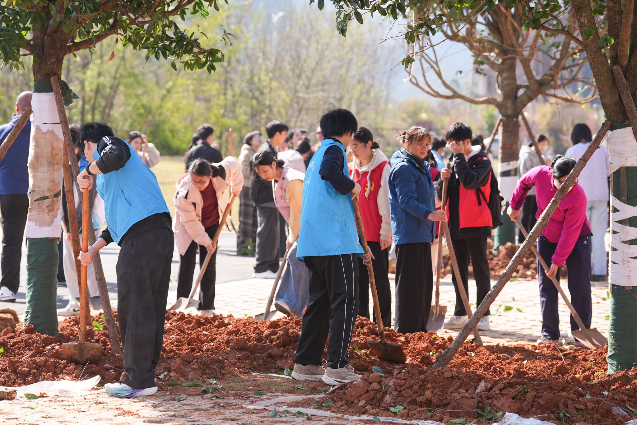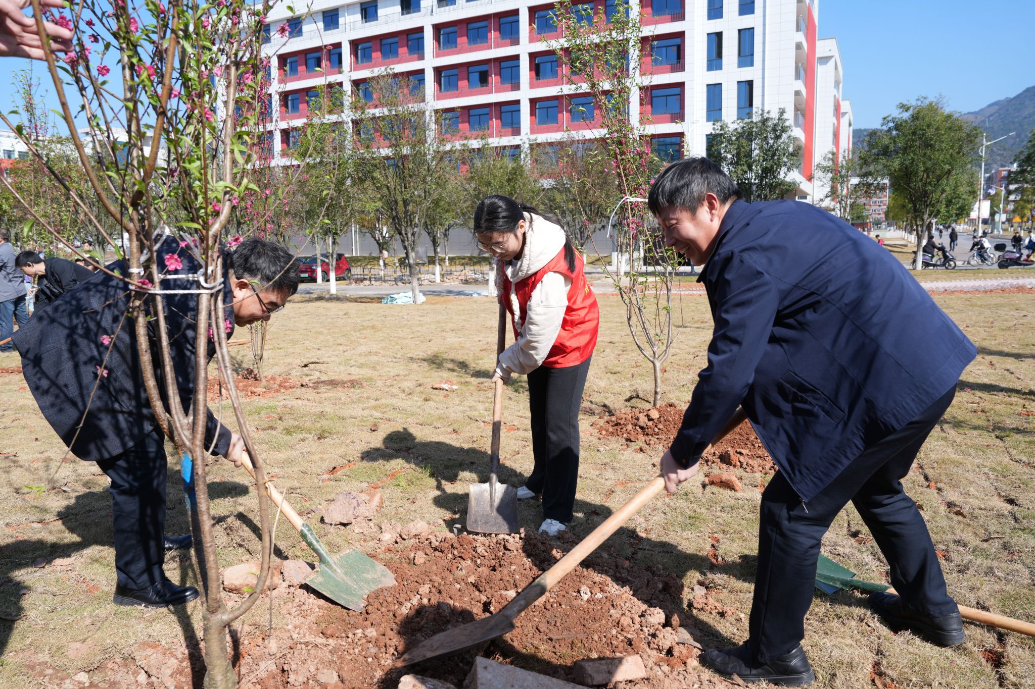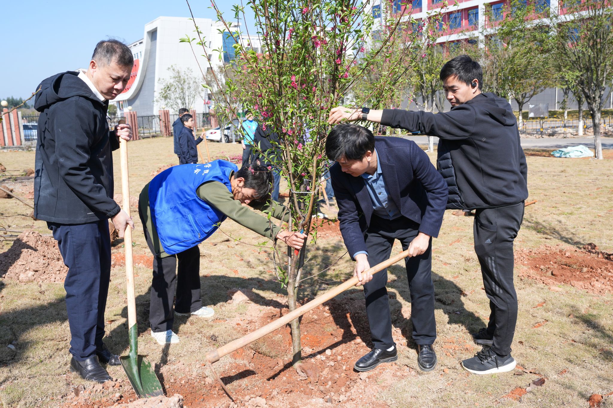 活动现场,全校师生精神饱满、干劲十足。大家分工协作、密切配合,每一道工序都有条不紊,呈现出一派热火朝天、欢声笑语的劳动景象。一棵棵新栽苗木迎风挺立,在春日的校园里舒展枝丫,为校园增添了勃勃生机。