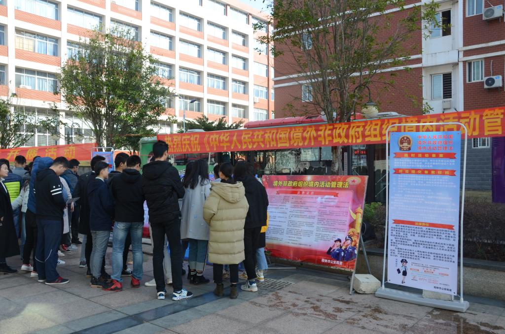 1月11日上午,桂林市公安局国保支队副队长胡世军、公安局法制支队副队长黄建平率队到pp电子开展《中华人民共和国境外非政府组织境内活动管理法》(以下简称“《管理法》”)实施一周年现场普法宣传活动。