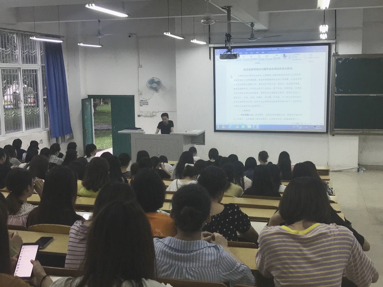 在毕业生离校安全教育主题班会上,毕业班辅导员通过案例对毕业生进行人身安全、财产安全、食宿安全、交通安全、求职安全等方面的教育,帮助毕业生增强安全意识,提高防范能力,做到防火、防盗、防病、防事故、防诈骗、防传销。也特别强调了荣校教育和法治教育,希望同学们在步入职场后,以严谨细致、踏实务实的工作态度和工作作风为母校争光,无论在工作还是生活中,一定要主动学习并掌握法律知识、树立法制意识、遇到问题或纠纷时,依靠法律途径解决,避免意气用事、不做触犯法律的事情,做遵纪守法的公民。