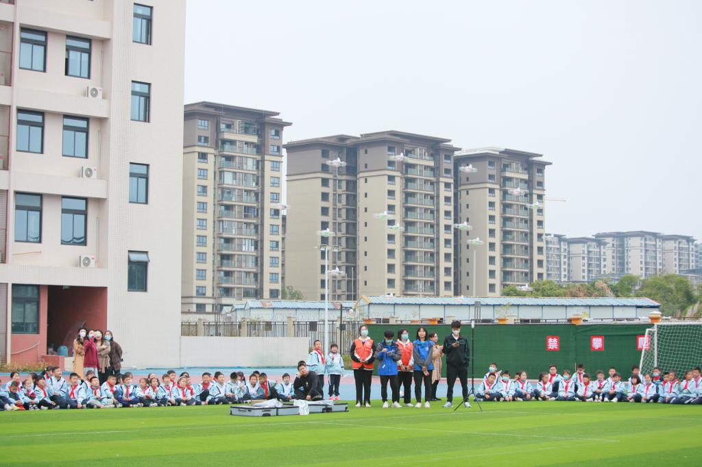 活动在20架无人机组成的编队徐徐升空中被推向高潮,它们不断在空中变换着不同的矩阵,整齐有序,几架系着彩带的滑翔机、穿越机先后起飞,在空中悬停、横滚、上下翻飞,一个个精彩刺激的展示动作,引发了学生们的阵阵尖叫和掌声。