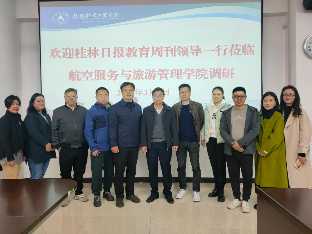 校企合作促就业,交流研讨谋发展。为深入学习宣传贯彻党的二十大精神,更好服务科教兴国战略,近日,桂林日报教育周刊主任吴林峰、融创桂林旅游度假区人力行政总监王强,受邀分别带队来校走访交流。航空服务与旅游管理学院负责人以及相关专业教师参加了交流研讨活动。