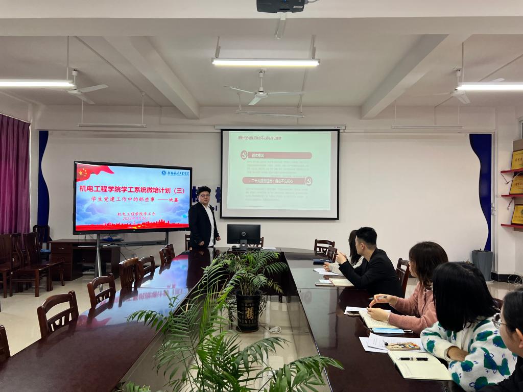 4月26日,机电工程学院学工队伍在巡天楼205会议室开展了辅导员微培计划第三期,本次会议主题为“党建工作中的那些事儿”,学院组织员、学生第二支部书记姚鑫作分享,全体辅导员参会。