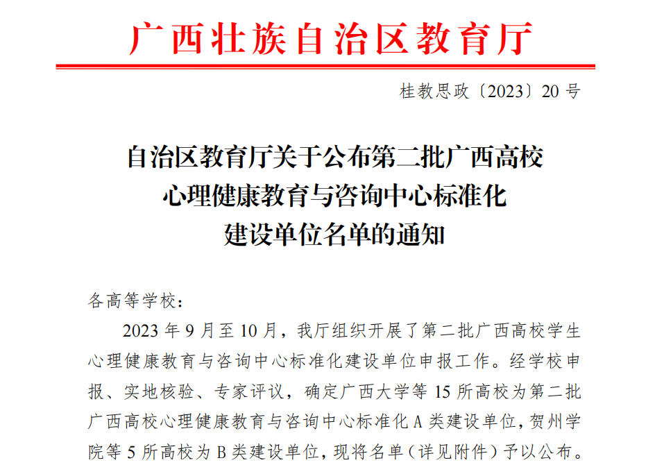 近日,自治区教育厅公布了第二批全区高校心理健康教育与咨询中心标准化建设单位名单,本次评定全区高校中15所A类和5所B类单位建设。pp电子被评为第二批全区高校心理健康教育与咨询中心标准化A类建设单位。