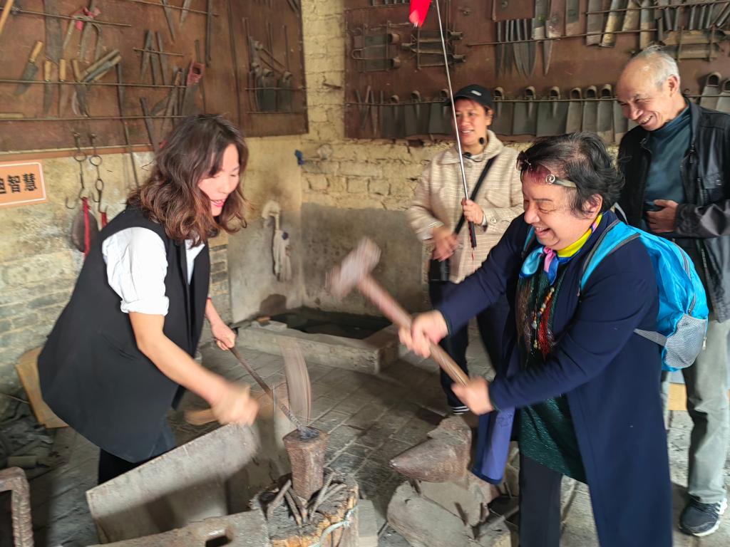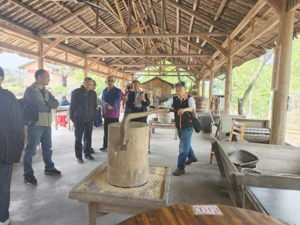 四月的古村,绿柳含烟、屋宇错落,老同志们紧跟讲解员脚步,了解到了桂北民俗、民间工艺、古村民居等,走过潮田河上的铁桥,就有豆腐坊、酒坊、打铁坊、油榨坊、水车、古桥等各式村景,作坊里制作的食品,土味十足。