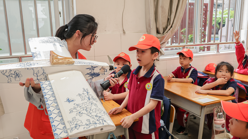 理论宣讲人陈彩香从飞机的基础知识讲到飞机的构造特点,再讲到无人机的发展和在生活中的应用场景,最后她在介绍火箭时还给同学们展示了火箭微模型,讲述了火箭的构造和工作原理,每一个知识内容都深入浅出,从“生活中哪些物品可以飞?”到“飞机的机翼有哪些形状?”等问题,不断引导学生一点点的思考,激发学生的探索兴趣,引导他们树立筑梦航天的远大梦想。
