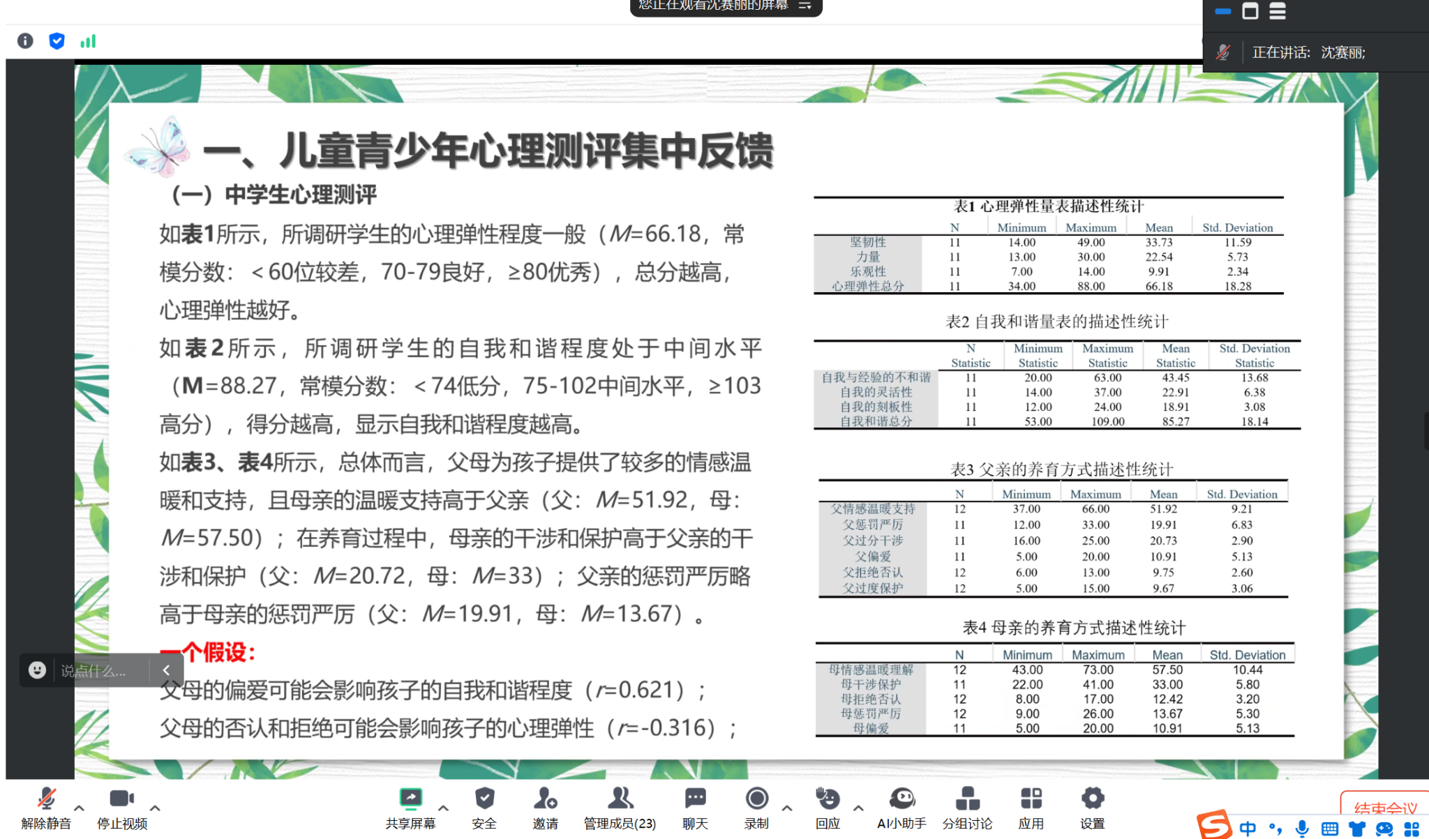7月16日晚,社会暑期实践团队在腾讯会议向儿童青少年家长开展青少年心理健康科普学习会。会上通过埃里克森人格发展八阶段理论、大脑功能、激素水平(如多巴胺、内啡肽)等理论来帮助青少年儿童家长进一步了解孩子的身心发展机制和过程,呼吁家长通过与孩子共同阅读书籍的方式帮助自己和孩子不断提升心理健康素养,共同守护心理健康。