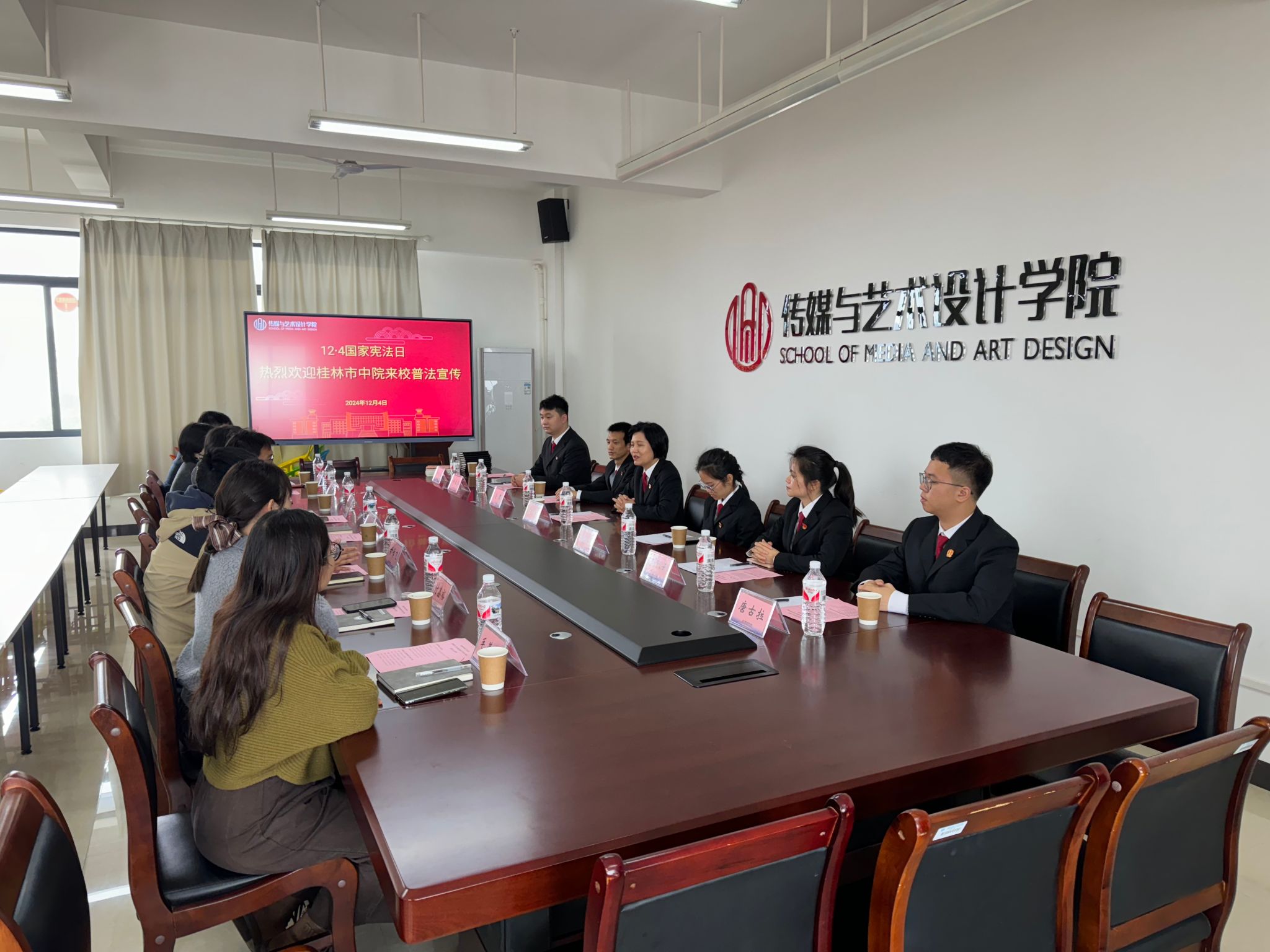 在活动前的普法宣传座谈会中,学院方表示,今后学院将持续开展多种形式的普法宣传教育,与桂林市中级人民法院通过共联共建,营造浓厚的法治育人氛围。桂林市中级人民法院机关党委专职副书记、政治部副主任兰燕表示,法院将积极延伸司法职能,加强与高校之间的沟通合作,不断加大普法宣传力度,持续深入开展法送校园活动,提升宪法宣传的覆盖面和影响力。