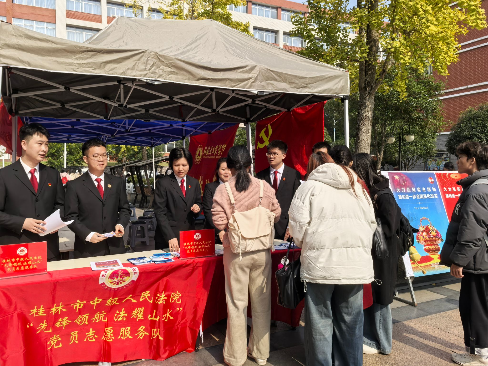 12月4日是第十一个“国家宪法日”,主题是“大力弘扬宪法精神,推动进一步全面深化改革”,为进一步凝聚法治共识,树立宪法权威,传媒与艺术设计学院邀请桂林市中级人民法院来校开展“12·4”国家宪法日普法宣传活动。桂林市中级人民法院机关党委专职副书记、政治部副主任兰燕一行6人开展现场活动。校党委副书记、纪委书记吴江萍莅临活动指导。