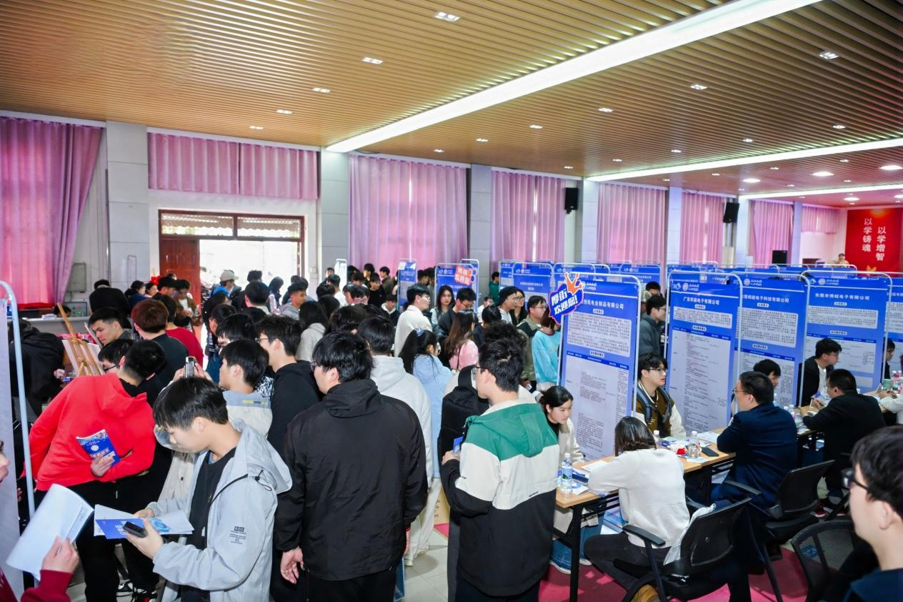 当日下午,"百万英才汇南粤"春季招聘双选会在学校招聘大厅举行。东莞四镇人社分局联合组织了50余家优质企业参会,涵盖智能制造、信息技术、新能源、现代服务等多个领域。