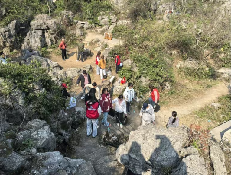同学们手持垃圾袋、垃圾钳等清洁工具,在汇通社区工作人员的带领下前往羊角山进行环境卫生整治。尽管山路崎岖不平,但同学们依然认真清理沿途发现的广告纸、塑料瓶和食品包装袋等垃圾,确保每一处角落都得到彻底清洁。经过一上午的努力,大量废弃物被收集起来,羊角山因此变得更加整洁。