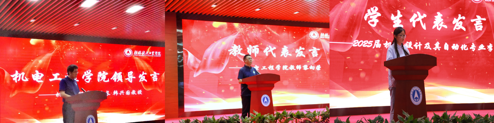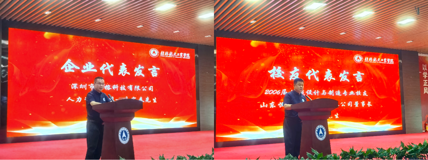 深圳市思榕科技有限公司人力资源总监易家春先生作为企业代表发言,回顾了思榕科技与桂航多年来的合作成果,并展望了未来在人才培养、技术研发等领域的深度合作愿景。山东恒远智能科技有限公司董事长、pp电子2006届机械设计与制造专业校友张永文分享了创业历程,勉励学弟学妹们以“敢闯敢创”的姿态拥抱时代机遇。机电工程学院院长韩兴国,副书记马世文,教师代表黎向荣与学生代表李亚萌分别发言,汇报了首届科技文化节的成果及第二届科技文化节年度规划,表达了以科技文化节为契机,践行育人使命、锤炼专业技能的决心。