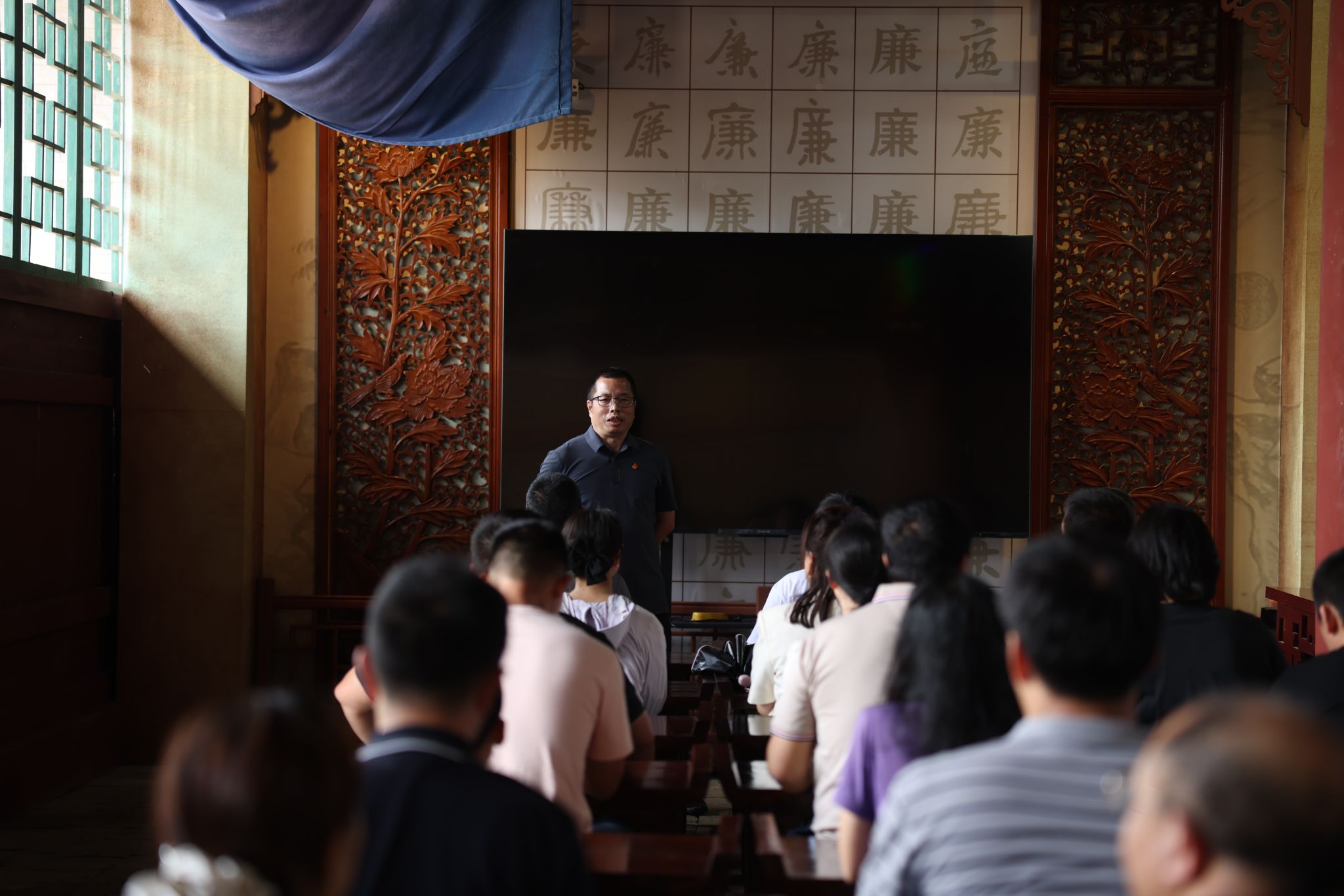 在周渭祠内,学院党委书记刘志勇同志为全体党员上了一堂生动而深刻的党课。他阐述了此次廉洁教育的深远目的与重大意义,并强调老师们要以古圣先贤、革命英烈为楷模,用心学习他们的感人事迹,倍加珍惜这来之不易的幸福生活,不忘初心、牢记使命,勇于担当、克己奉公,并带领大家学习了违反中央八项规定精神的典型案例,为老师们敲响了警钟。