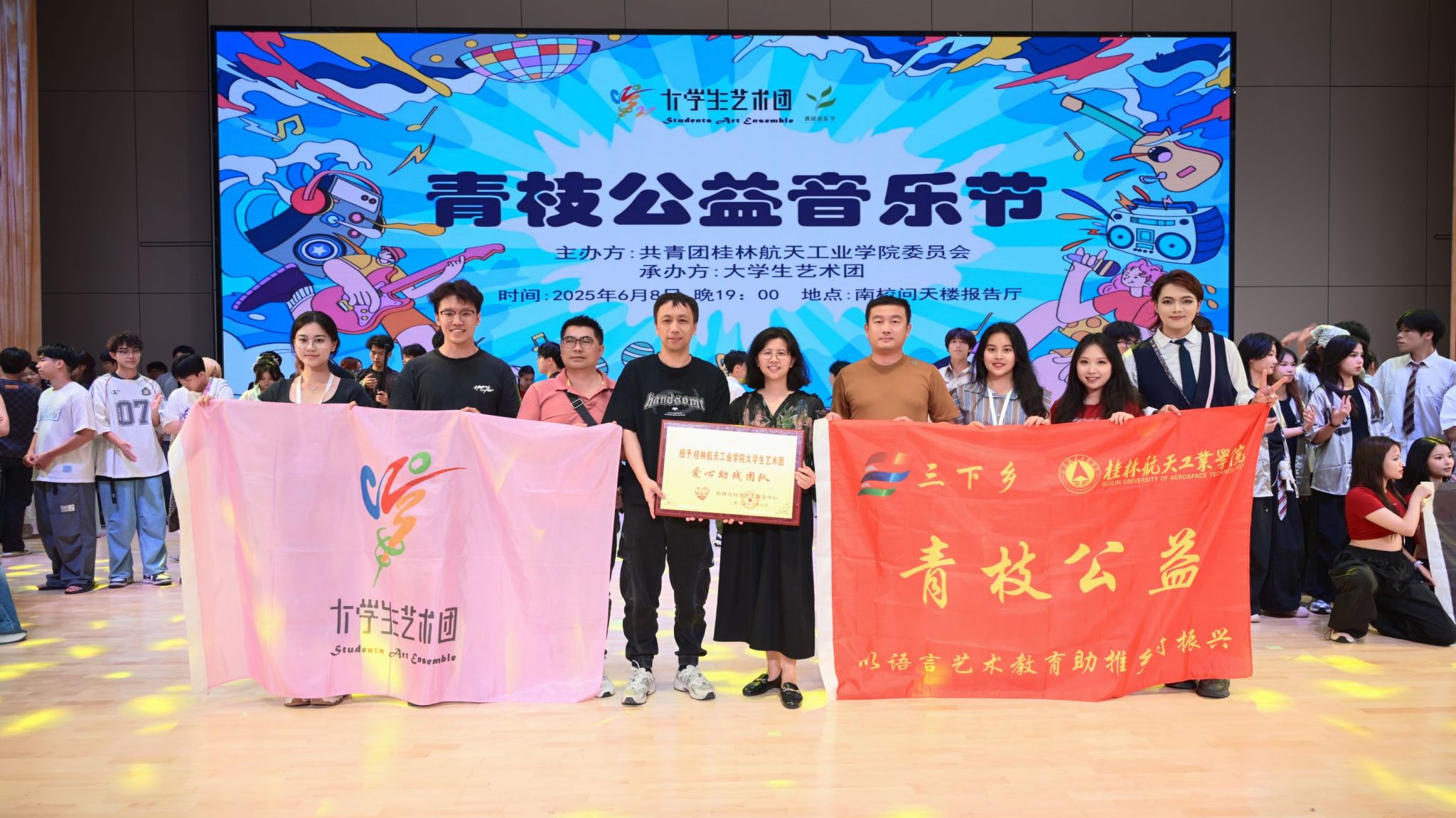 6月9日晚,由校团委主办,大学生艺术团承办的“绿意青枝 艺术筑梦”青枝音乐节在南校区问天楼报告厅隆重举行。桂林市好善社工服务中心秘书长吴永灏、校团委负责人、艺术团各队伍指导老师、师生代表共五百余人观看了此次活动。