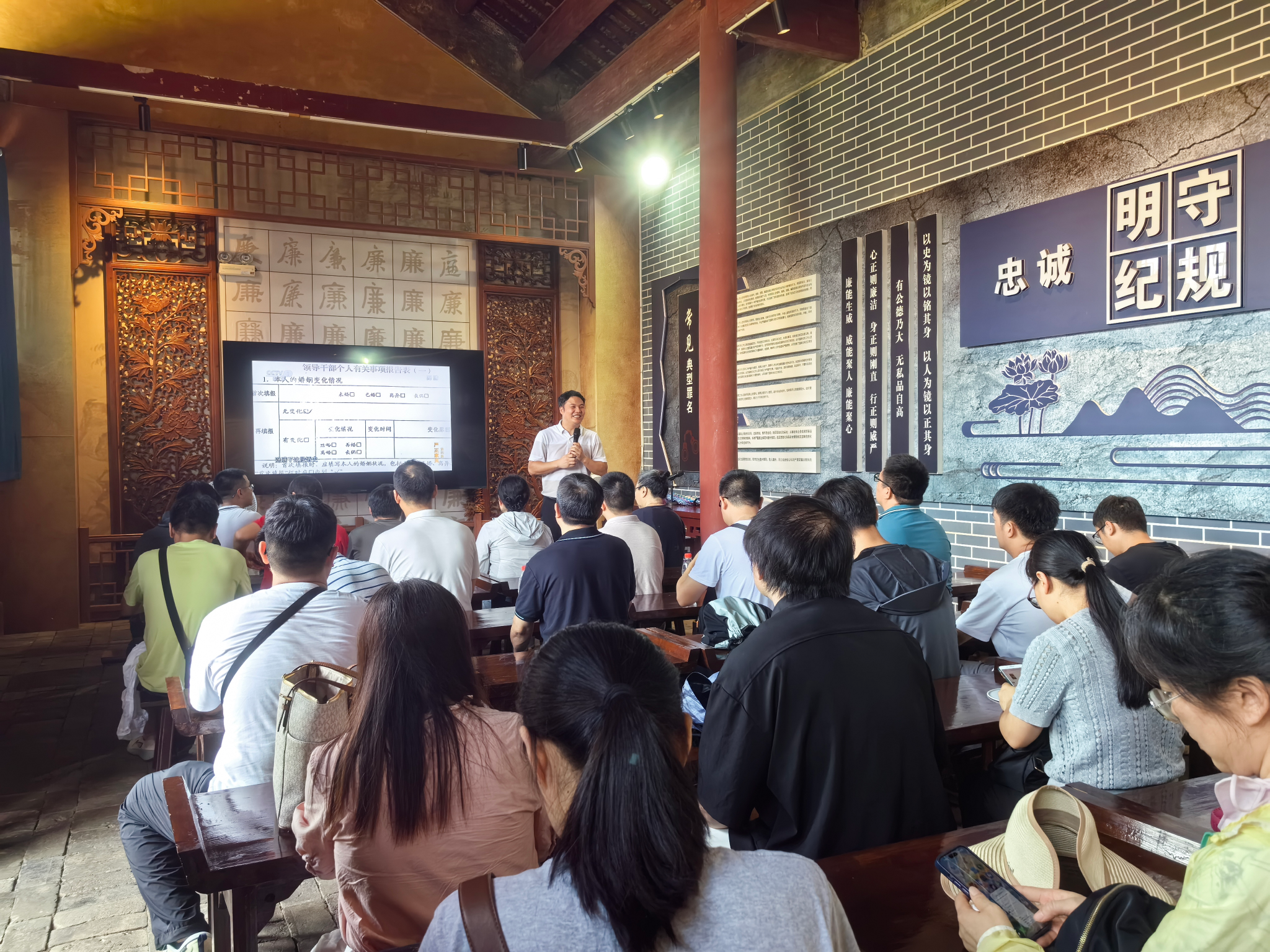 随后,教职工一行前往广西桂林廉政教育基地——周渭祠开展沉浸式学习。在杨华书记的带领下,全体人员深入了解北宋廉吏周渭“清廉为官、勤政为民”的生平事迹,通过一幅幅历史画卷、一件件实物展陈,感悟中华优秀传统文化中“崇廉尚德”的精神内核。现场集中学习环节,杨华结合中央八项规定精神,以《永葆清正廉洁政治本色》为题开展专题辅导,通过剖析违反中央八项规定精神的典型案例,警示党员干部严守纪律规矩;集体观看的警示教育片以鲜活案例引发深思,进一步筑牢拒腐防变思想防线。