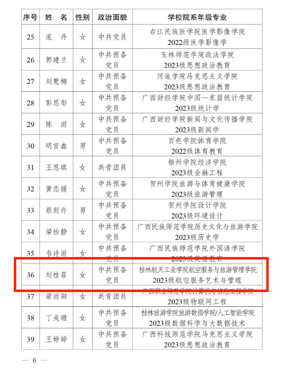近日,2025年广西青年马克思主义者培养工程高校班入选名单公布,航空服务与旅游管理学院学生第二党支部预备党员、2023级航空服务艺术与管理专业刘桂菲,凭借扎实的政治理论学习,积极投身社会实践与校园建设的经历,从众多学生骨干中崭露头角成功入选。为pp电子入选此次“青马工程”高校班唯一学员,也是自2022年以来该支部再次有学生党员入选。
