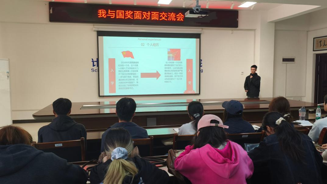 在“我与国奖面对面”交流会上,国奖获奖者分享了各自的成长历程。韦钰娟以“敢开始就会有收获”的经历,让大家看到厚积薄发、从确立小目标到突破自我的路径;任馨懿以“主动试错、坚持深耕、锚定目标”分享规划大学生活的新视角;刘永昌则围绕“深耕不辍 方得荣光”,讲述了自己从社恐到担任班干、成为入党积极分子、参加学科竞赛的成长故事。现场同学认真聆听,从这些鲜活的榜样故事中体会到,优秀源于日复一日的坚持与努力。