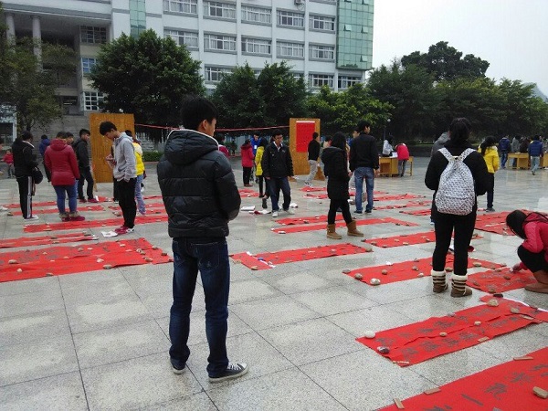 书画协会提前精心准备,积极动员,征集对联词,购买墨汁、红纸、毛笔等材料。对联由书画协会指导老师唐优泉和李红文老师带领一批优秀的书法爱好者认真书写。书法爱好者们现场书写,边写边送,一幅幅对联,一张张红纸,像过年一样,使整座校园显得喜气洋洋。本次活动表达了pp电子学子在新春到来之际对桂航明天的美好期盼和祝福,引来众多学子不断地喝彩声,活动取得圆满成功。