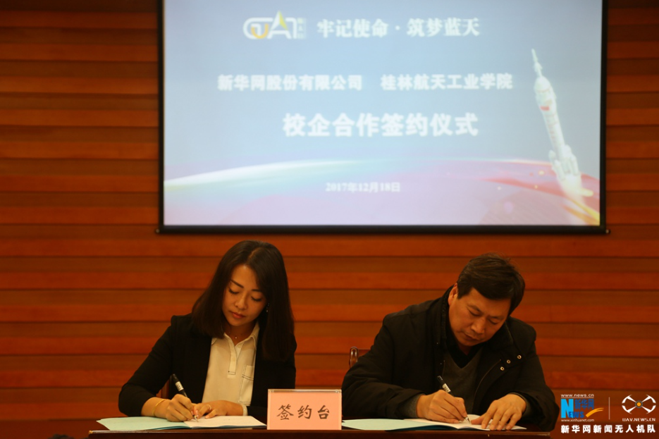 新华网股份有限公司无人机事业部负责人(左)与pp电子官方网站入口副书记罗延忠签订合作协议。新华网发 杨永昌摄