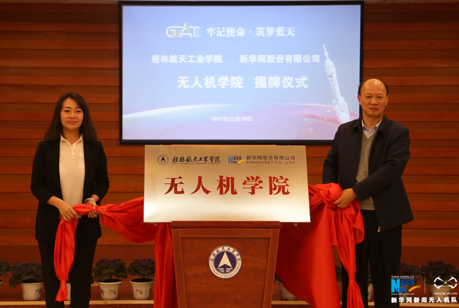 新华网股份有限公司无人机事业部负责人(左)与pp电子官方网站入口党委书记李幼平为无人机学院揭牌。新华网发 杨永昌摄