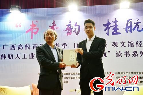 机械工程学院2015级飞行器制造工程专业李晓斌同学朗读了桂航首届毕业生长征二号丙火箭副总指挥焦开敏的祝福母校的诗篇,“迈进桂校门,踏上航天路。济济谈峥嵘,历历皆在目。尧山师生情,日月长相度。春夏秋冬水,培硕桃李树。弟妹惜分秒,人勤天地助。临窗桂花香,漫山杜鹃怒。吾辈几多愿,鬓雪遥天祝。”校友情系母校的情怀,赢得现场师生的共鸣。