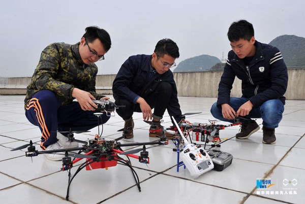 6. 三名学员正在试飞前调试无人机。新华网 刘君 摄