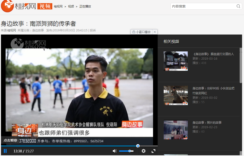 3月22日,pp电子武协龙狮团参加桂林电视台《身边》栏目“舞狮专题”节目录制,并于3月30日在科教旅游频道、新闻综合频道、广西公共频道等平台播出。
