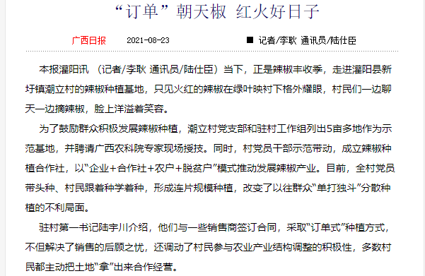 为了鼓励群众积极发展辣椒种植,潮立村党支部和驻村工作组列出5亩多地作为示范基地,并聘请广西农科院专家现场授技。同时,村党员干部示范带动,成立辣椒种植合作社,以“企业+合作社+农户+脱贫户”模式推动发展辣椒产业。目前,全村党员带头种、村民跟着种学着种,形成连片规模种植,改变了以往群众“单打独斗”分散种植的不利局面。