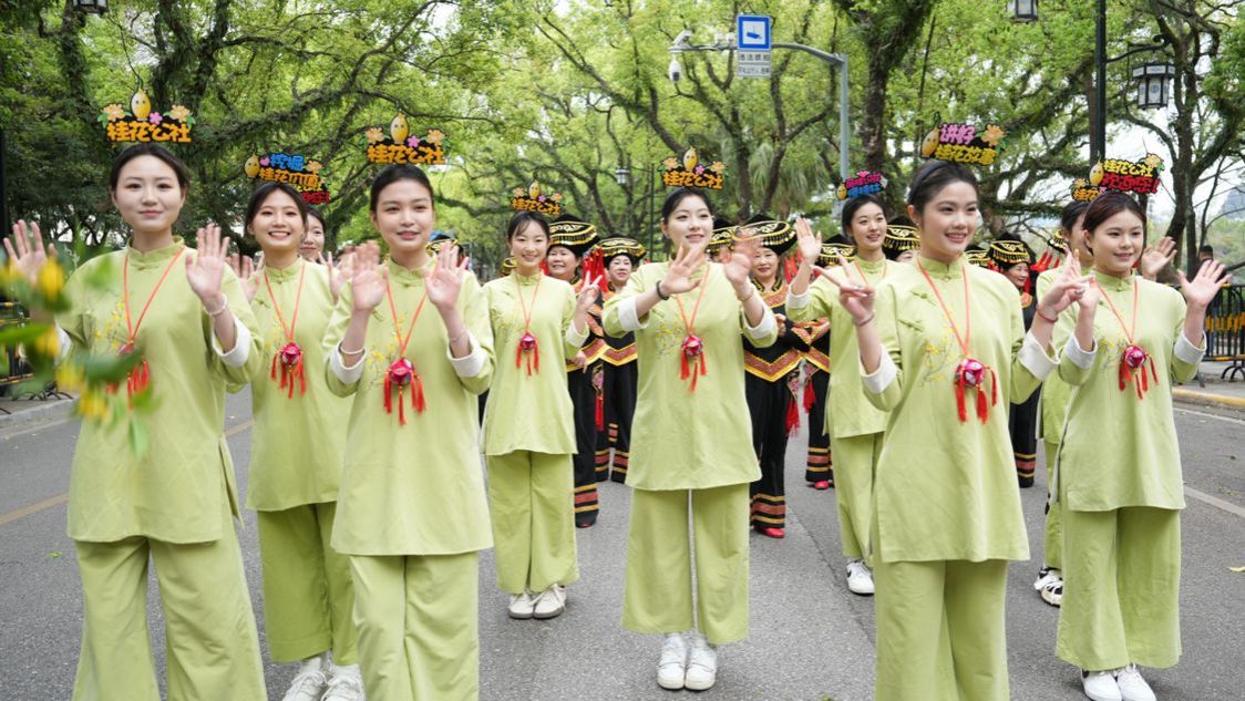 3月29日,桂林市秀峰区第十四届 “三月三” 民族歌圩荟、“文旅焕新” 巡游活动盛大开启,pp电子官方网站入口航空服务与旅游管理学院2024级空中乘务专业学生组成的桂航空乘方阵在活动中大放异彩。