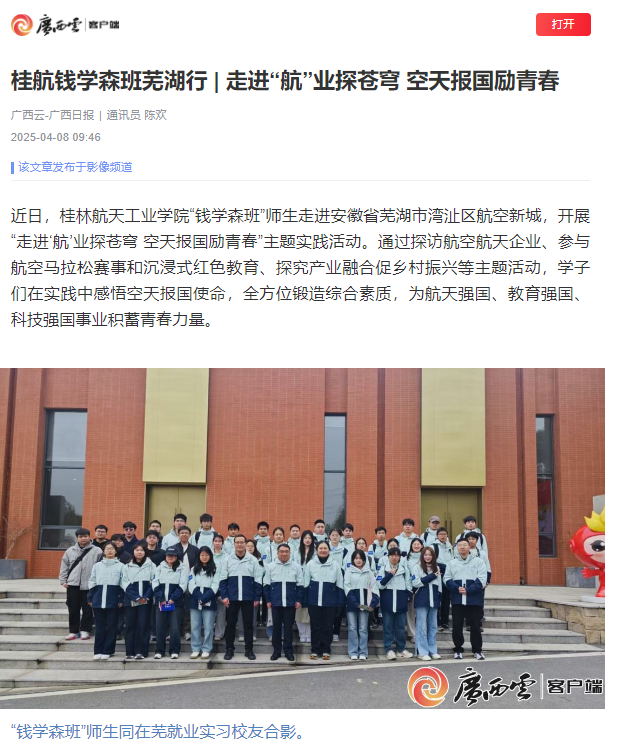 目前,湾沚区已与学校初步达成战略合作意向,双方将进一步共建低空经济产学研基地,推动人才链与产业链深度融合。随着更多桂航学子走出课堂、融入产业,新时代航天精神的传承发展正焕发蓬勃生机。