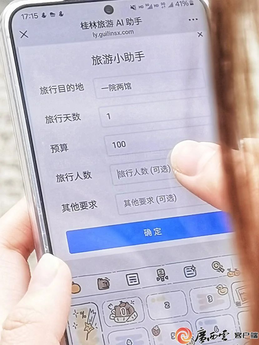 今年3月,“桂林旅游AI助手”上线。游客可搜索微信公众号“桂林一城游”,点击公众号下方导航栏中的“AI小助手”即可进入与“桂林旅游AI助手”聊天的界面。游客不仅能点击对话框中预设的问题,查询“AI助手”的解答,也可以咨询自己想要了解的内容。界面中还设有“行程规划”选项,游客填写旅行目的地、旅行天数、预算、旅行人数等信息后,系统会根据游客的具体要求生成一份详细的行程方案。该项目由桂林旅游股份有限公司旗下桂林一城游公司携手桂林电子科技大学共同研发,能精准提供行程规划、美食推荐、游玩项目建议等,结合热门景区进行推荐,参考性强。