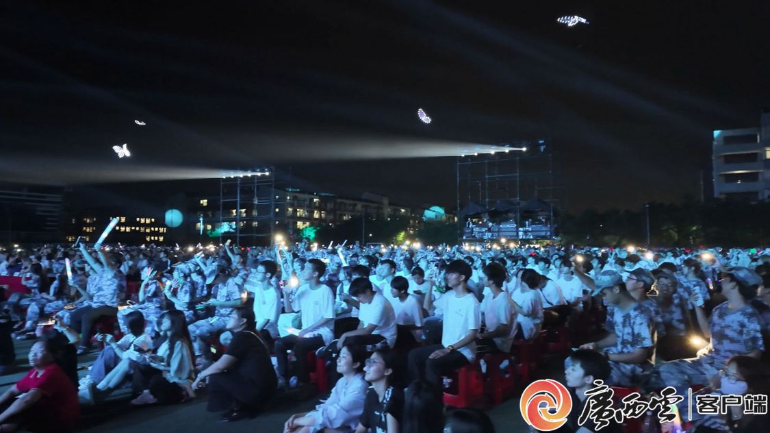 同心放歌,礼赞伟大时代。晚会在大合唱中迎来最高潮。当《蝴蝶泉边》的悠扬旋律响起,数架蝴蝶扑翼机在夜空中翩然起舞;而当《我爱你中国》的歌声响起时,全场师生纷纷点亮手机手电筒,万千光点汇聚成一片摇曳的星海。就在这动人时刻,一架凤凰航空模型腾空而起,与地上的“星海”遥相呼应,在夜空中划出绚丽的轨迹。全体师生用最真挚的歌声,向祖国献上最深情的告白。